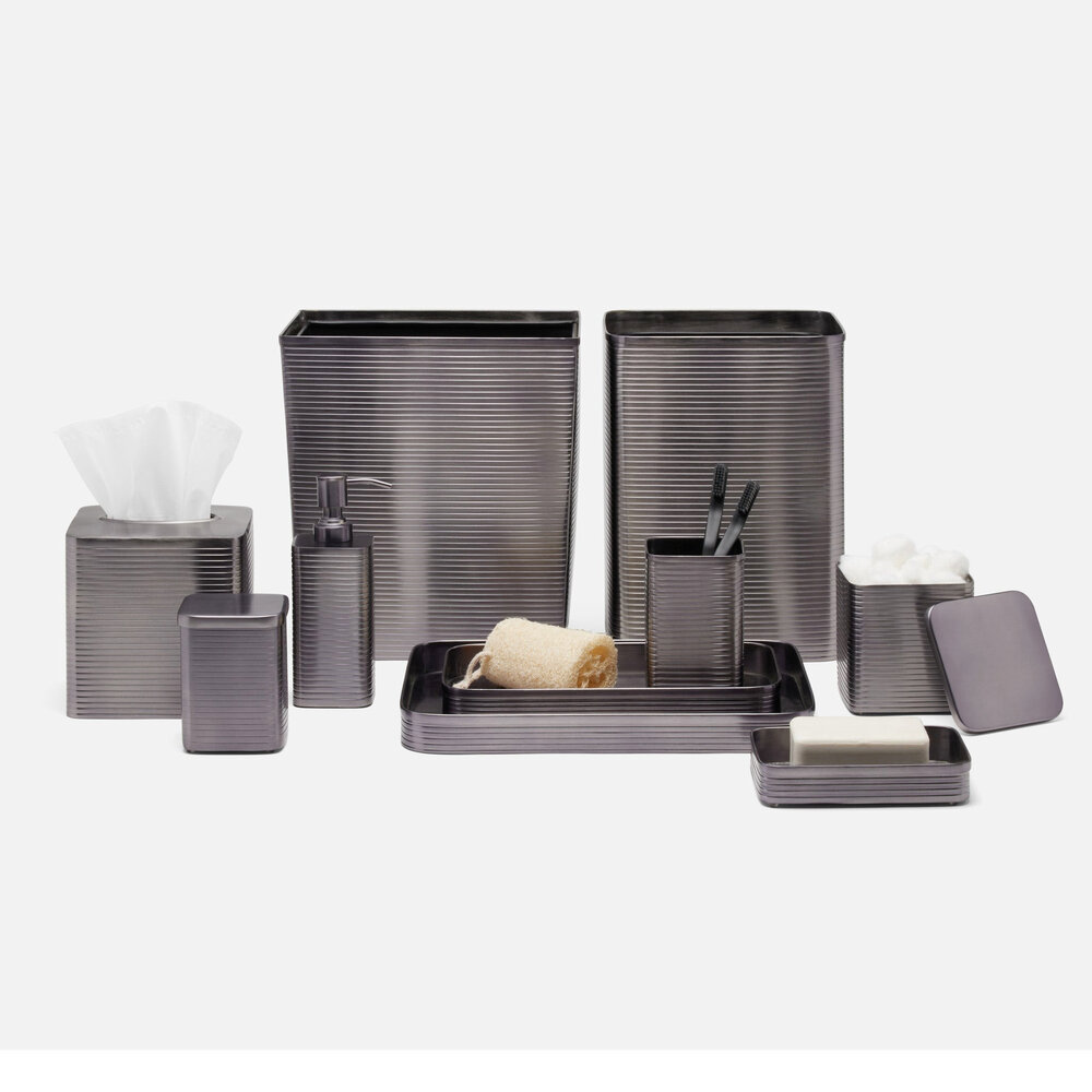 This bath collection's textured stripes—crafted from matte metallics over brass—give the bathroom a clean, polished look. Rounded corners enhance the shine of each piece.