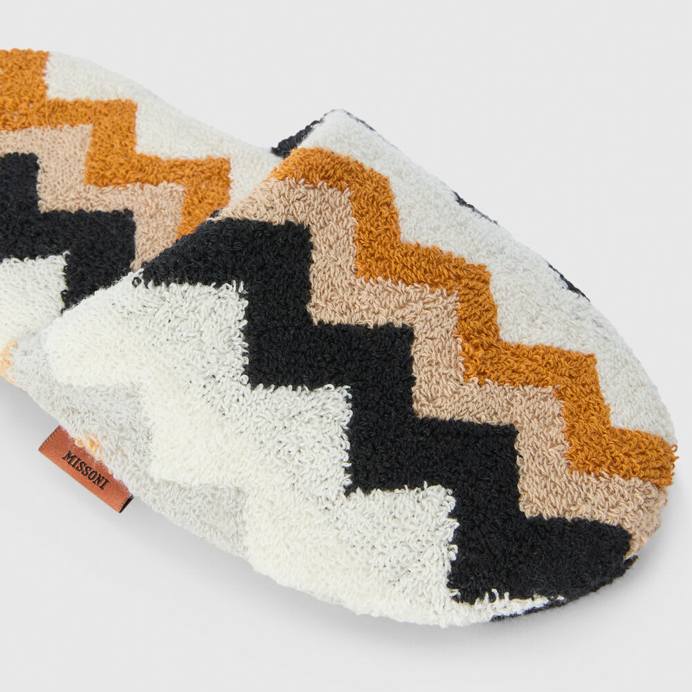 The Missoni slippers, crafted from soft cotton, combine comfort and sophistication in an iconic design. The unmistakable zigzag pattern adds a touch of lively elegance, perfect for moments of relaxation. Finished with a visible logo label, these slippers are the ideal accessory to envelop your feet in distinctive and cozy style.