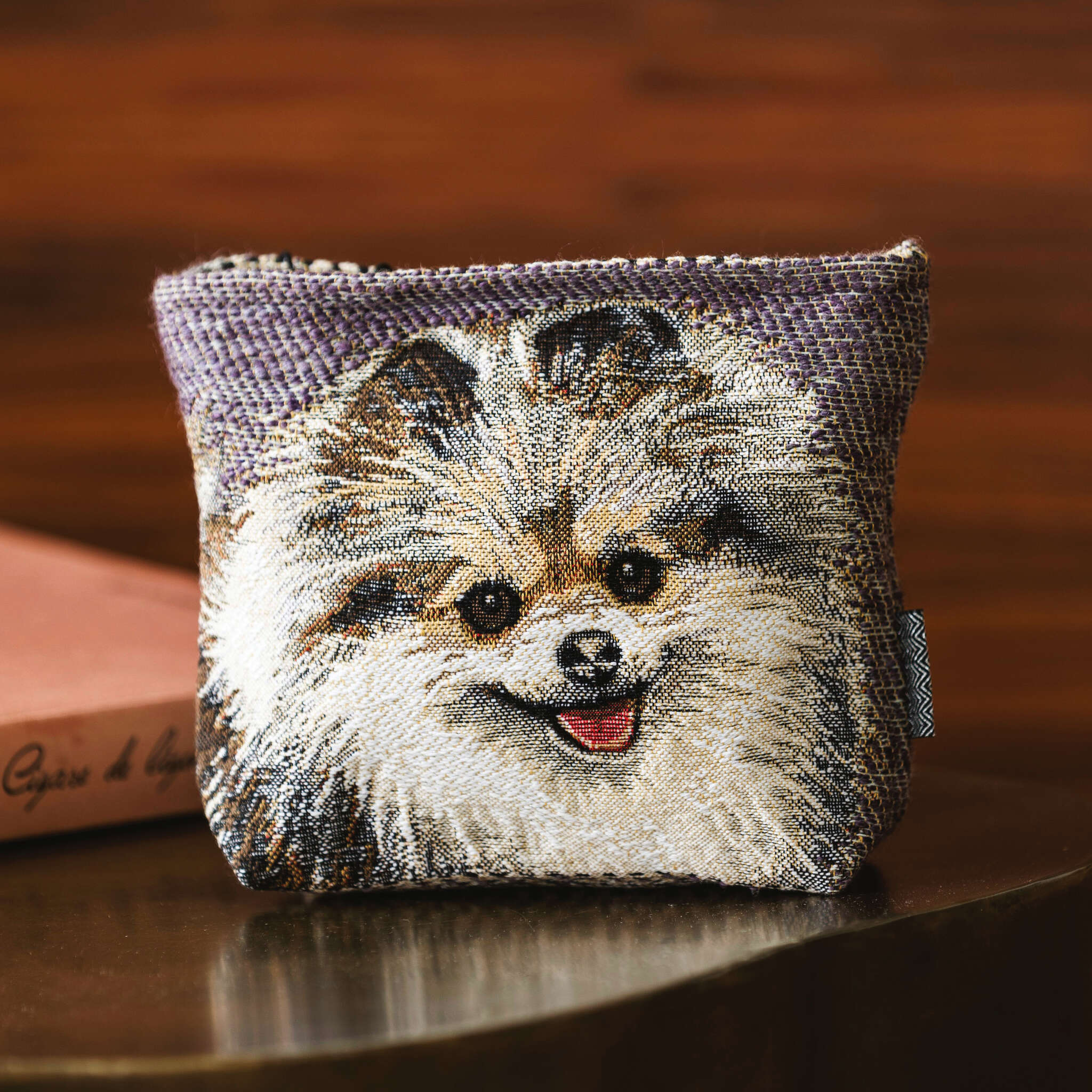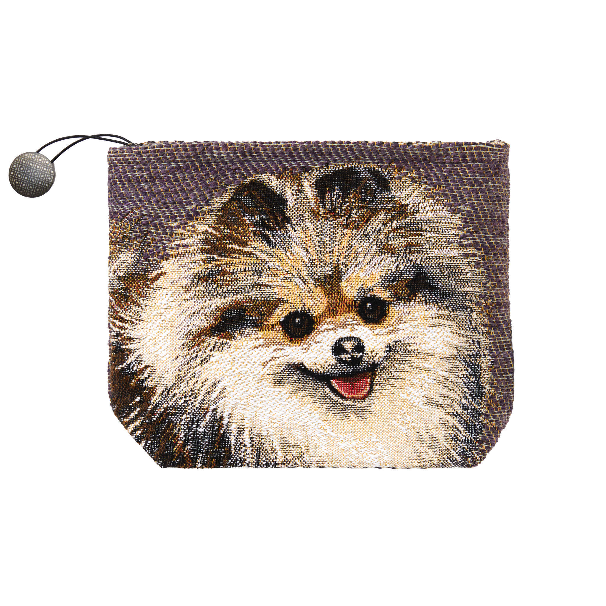 Tousled and happy, an adorable spitz is unleashed on two varieties of curly backgrounds. Jacquard tapestry wooven in Belgium.
