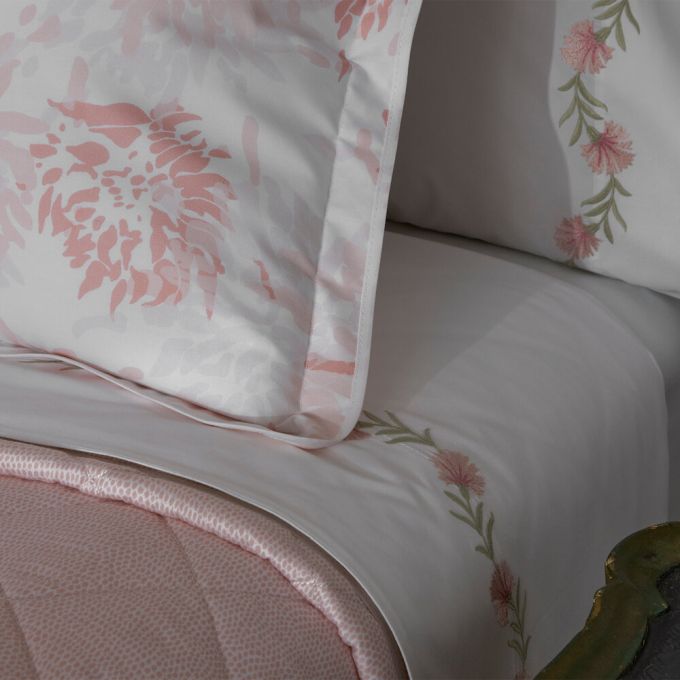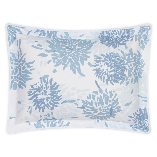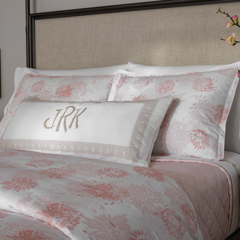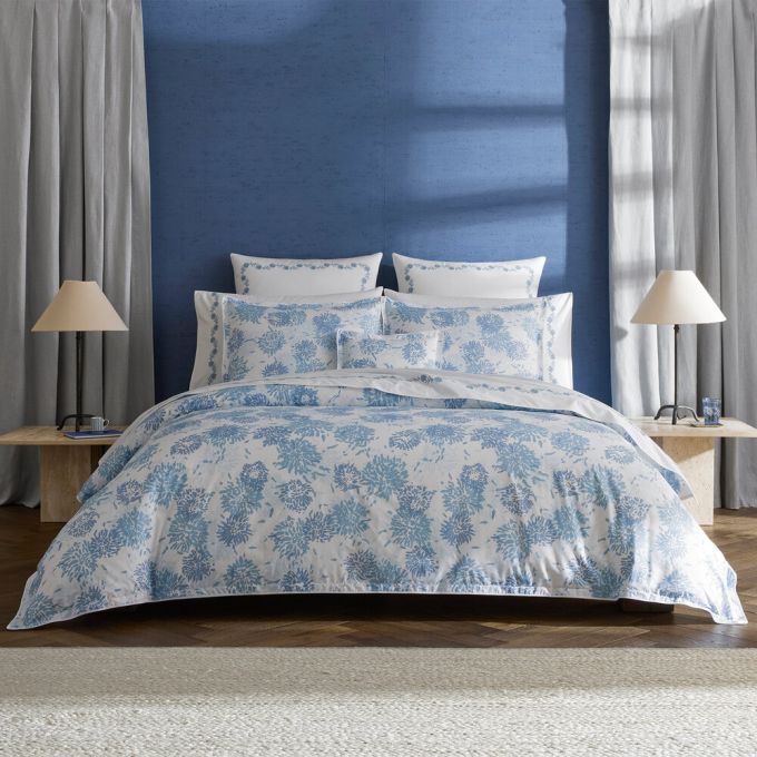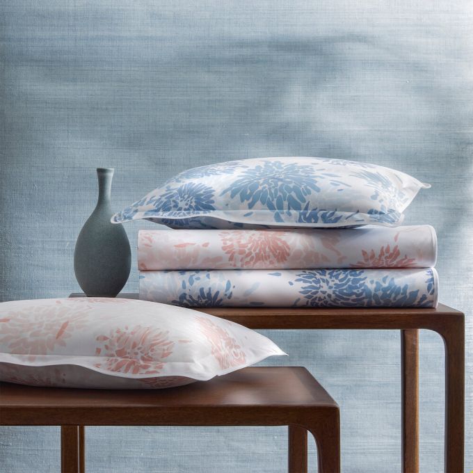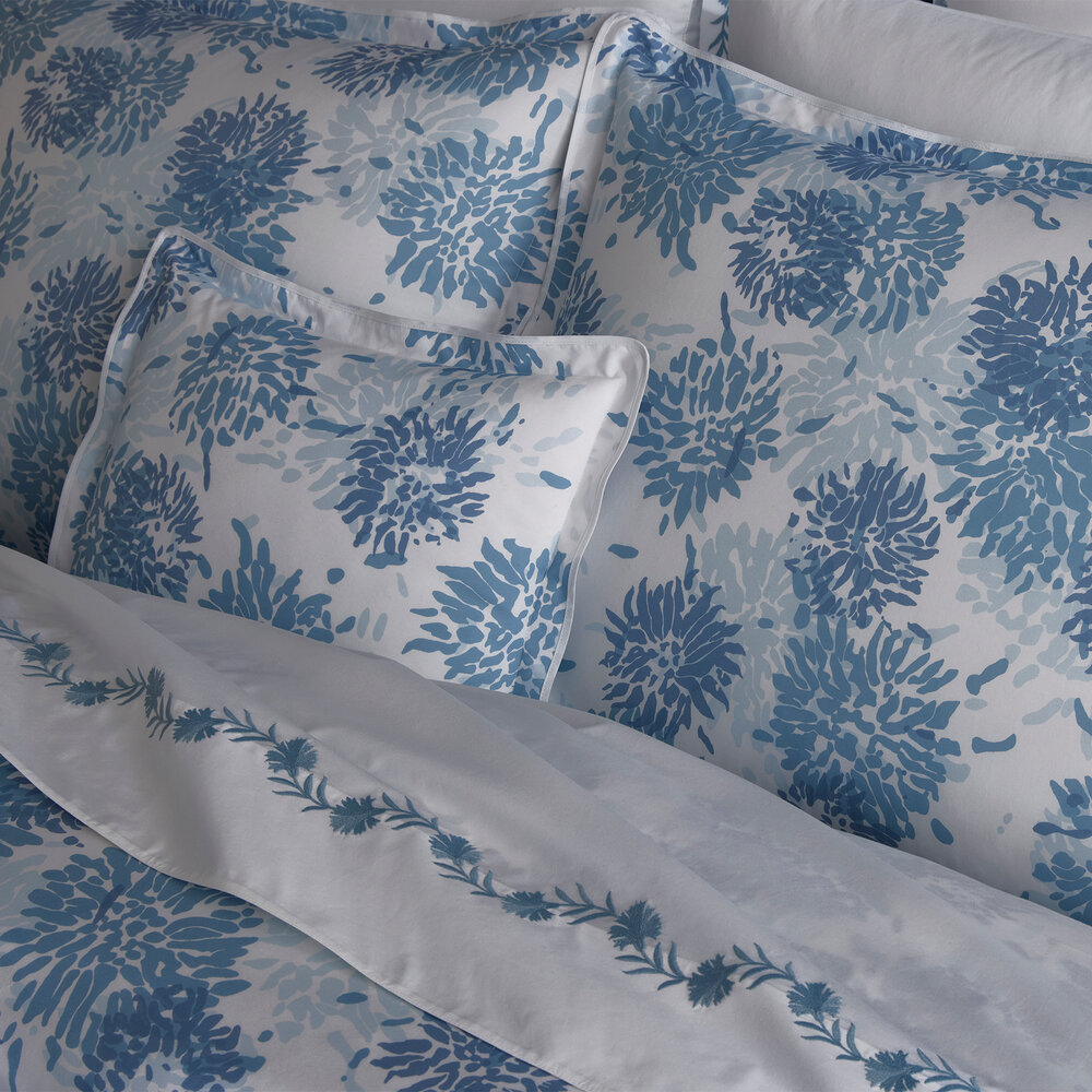 Chrysanthemum is a Matouk Tillett style inspired by one of Tillett Textiles's most iconic prints. Originally designed by DD Tillett and famously featured in Jacqueline Kennedy Onassis's Hyannis Port home, this beautiful pattern on crisp Luca percale features a flowing floral motif and soft, painterly lines. It lends a graceful, romantic sensibility to the bed.