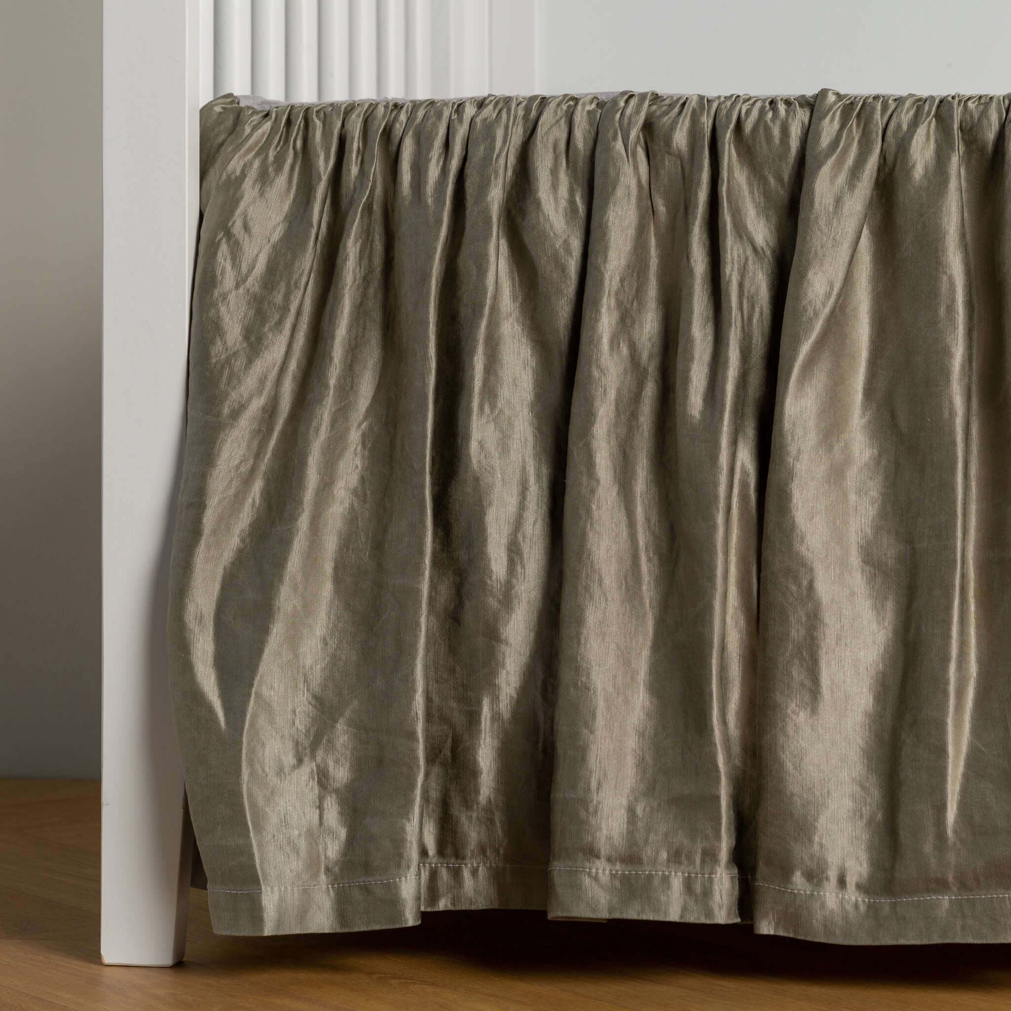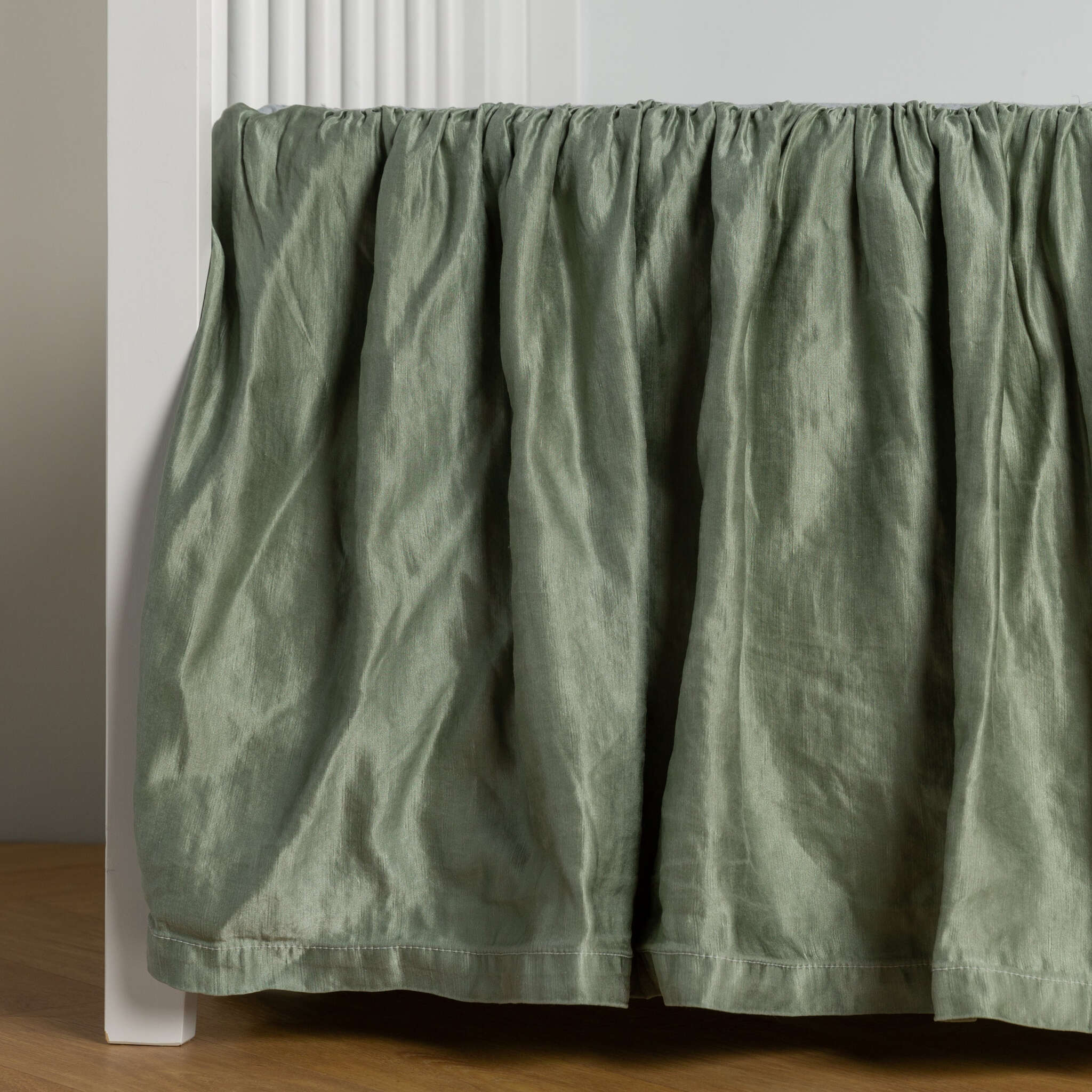 Our Paloma Crib Skirt is an iridescent vision in silk charmeuse. A luxurious layer for the base of the crib, this silken skirt is machine washable and small batch dyed.