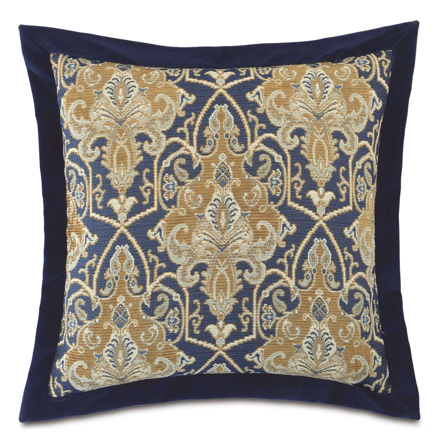Euro Sham: Decorative pillow with gold and blue design. Pattern is centered. Mitered flange on edge.
