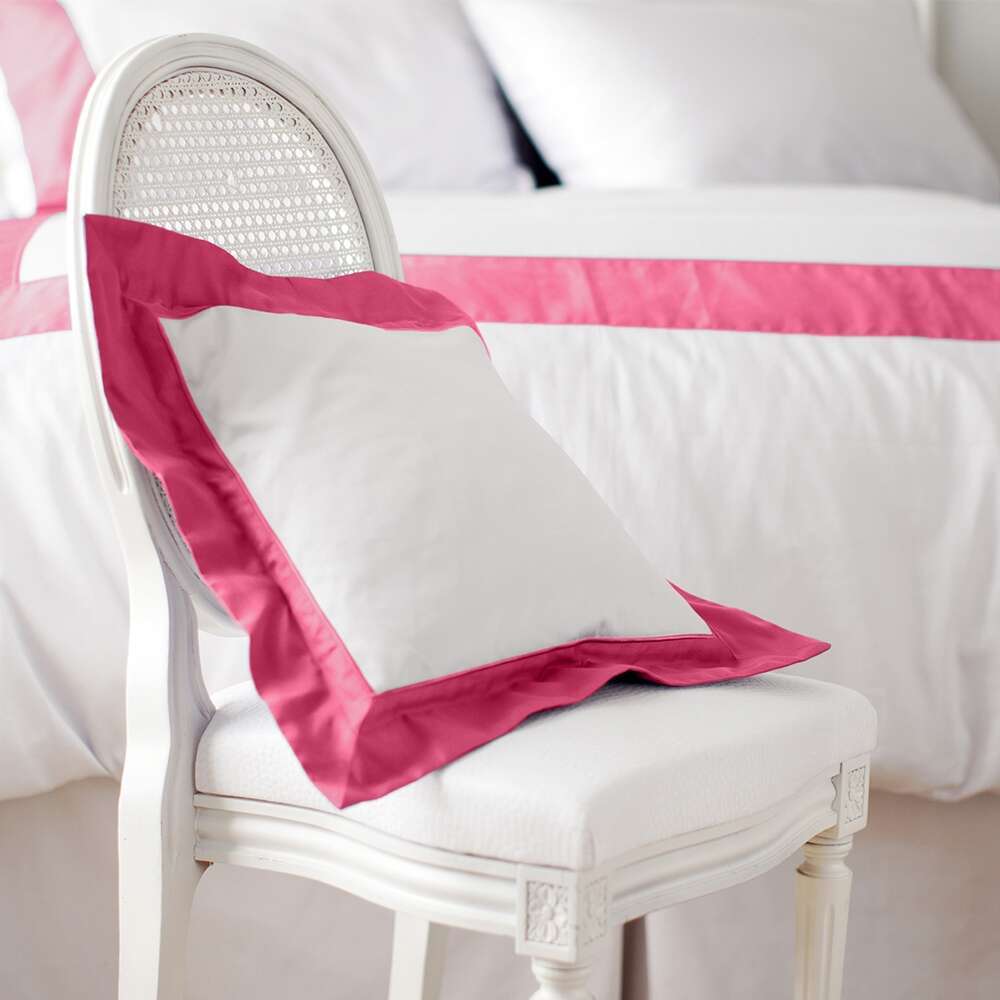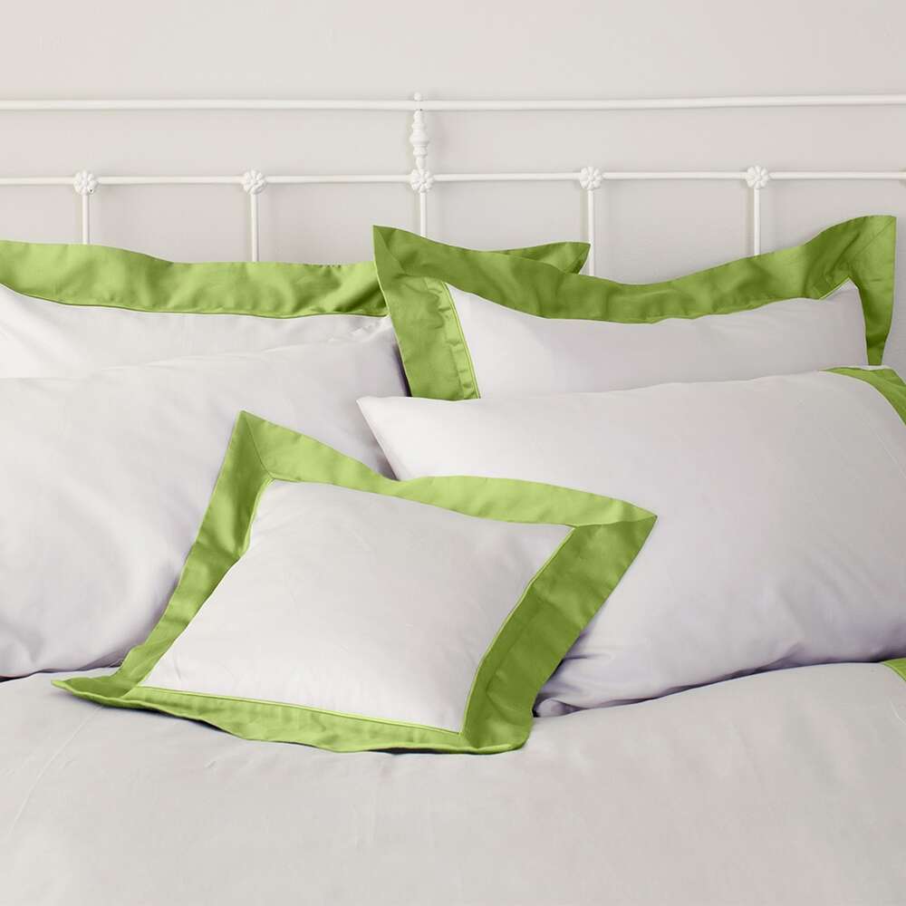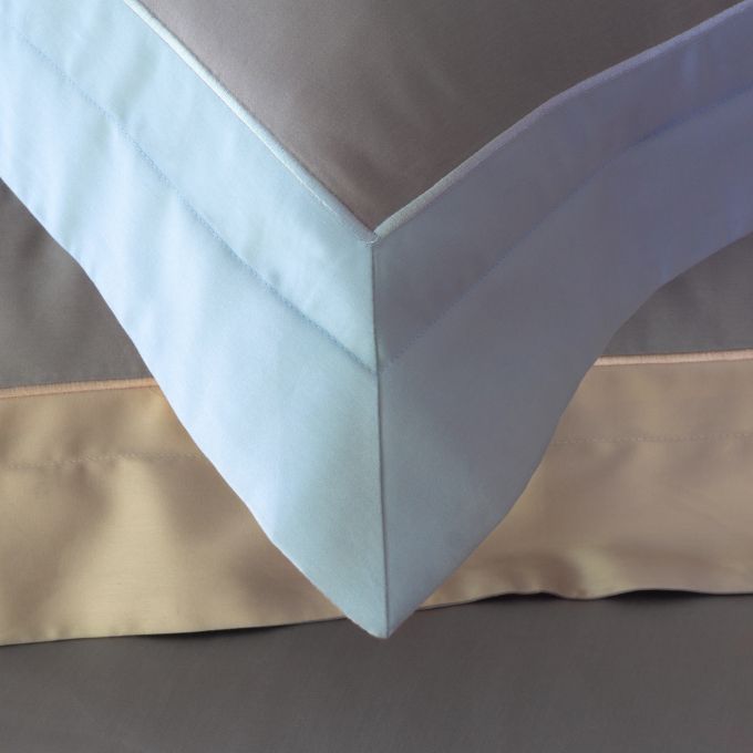 Sham: 2.5" Flange. Satin stitch. Backed in band colour. 3.5" contrast band on rectangle sham. 4" contrast band on Euro and Grand. Back zipper.