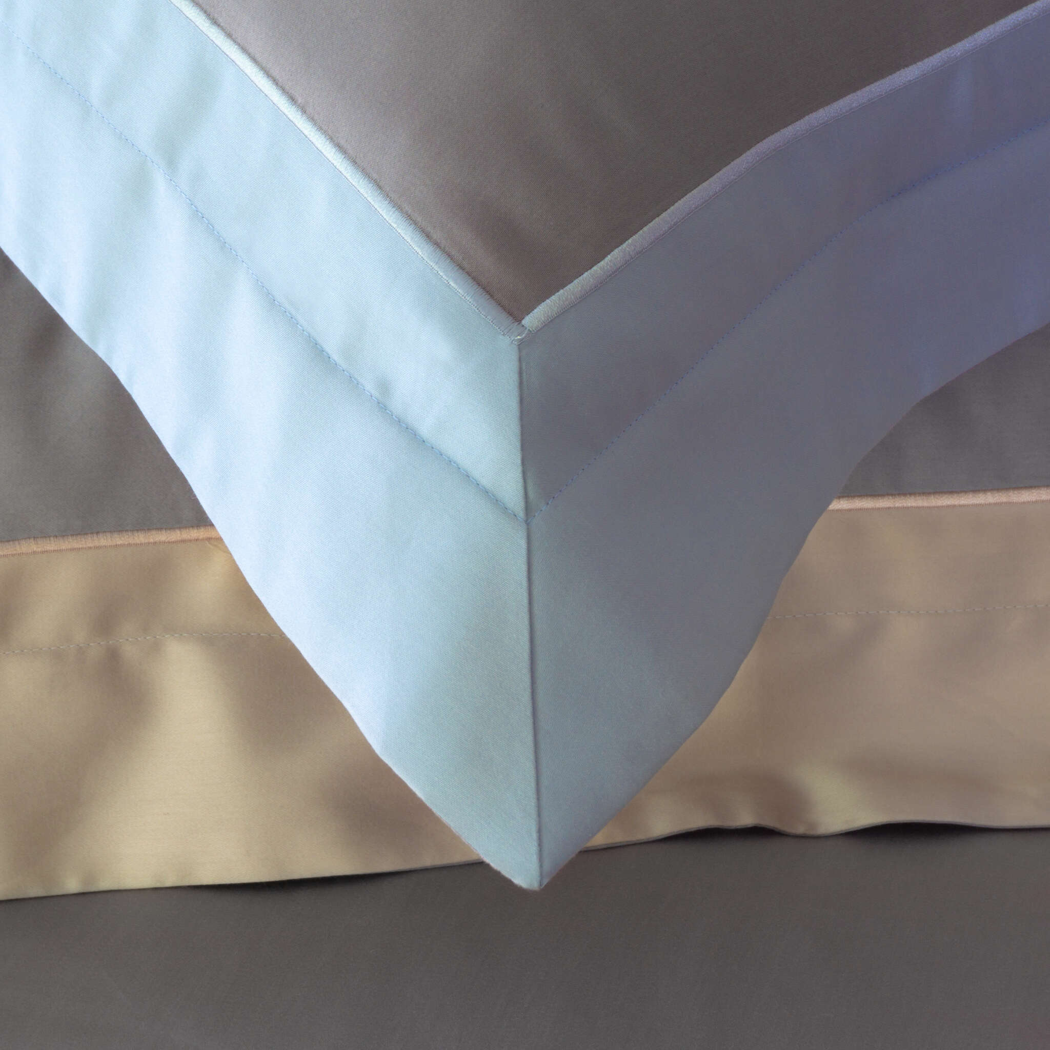 Duvet Cover: Backed in Capri main colour. 1" flange. 5.25" contrast band. Hidden zipper in flange.