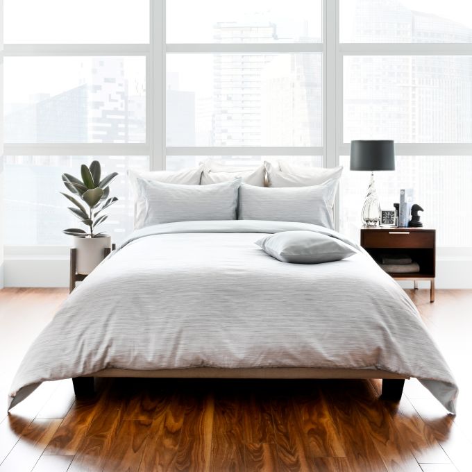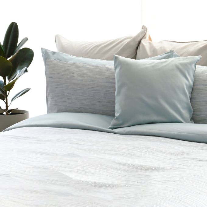 A luxuriously soft cotton jacquard, Vista features subdued melange striations, bringing an air of calm and sophistication to this bed linen. Knife-edge finishing and a bold 3" solid colour border on the shams infuse this set with contemporary style.