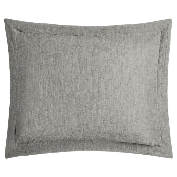 Atacama on the front of the sham, reversing to a tone-on-tone Gaia percale, finished with a flange and plain hem.