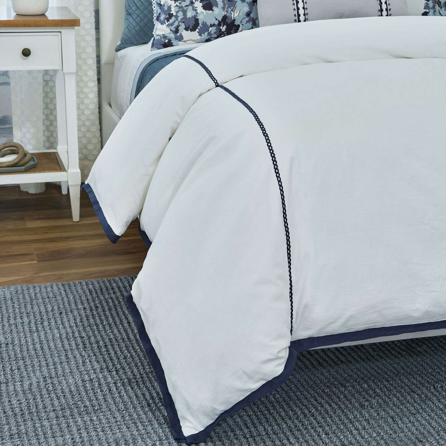 Duvet Cover: 100% white cotton duvet cover/ comforter with Bonnie Navy Gimp sewn on seams. Self-backed in Baldwin White. Flange edge finish with butterfly pleats on each corner. Button closure for easy use