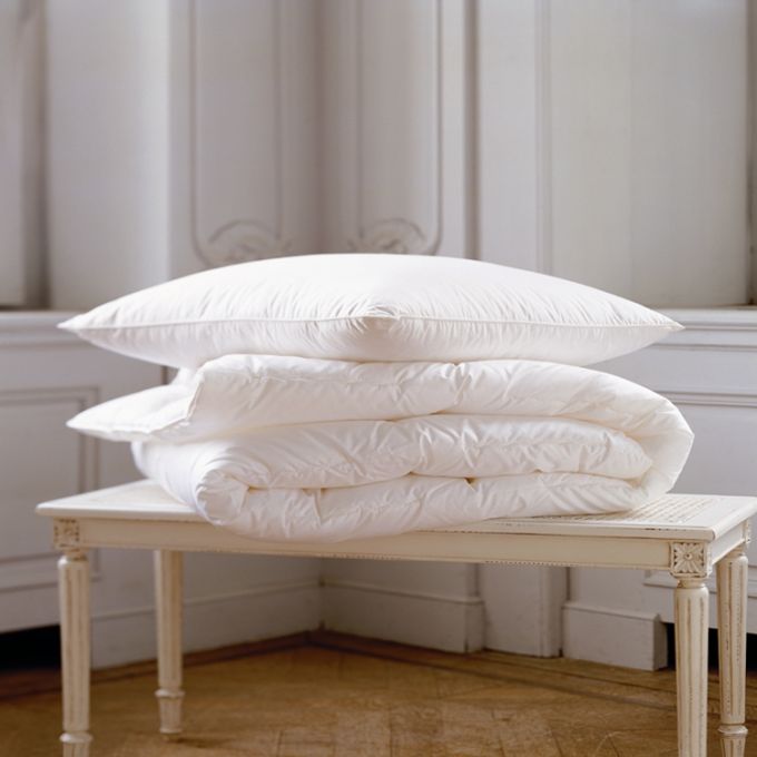 All Yves Delorme down comforters have double stitch construction with piped edges, preventing down from exiting the sides.