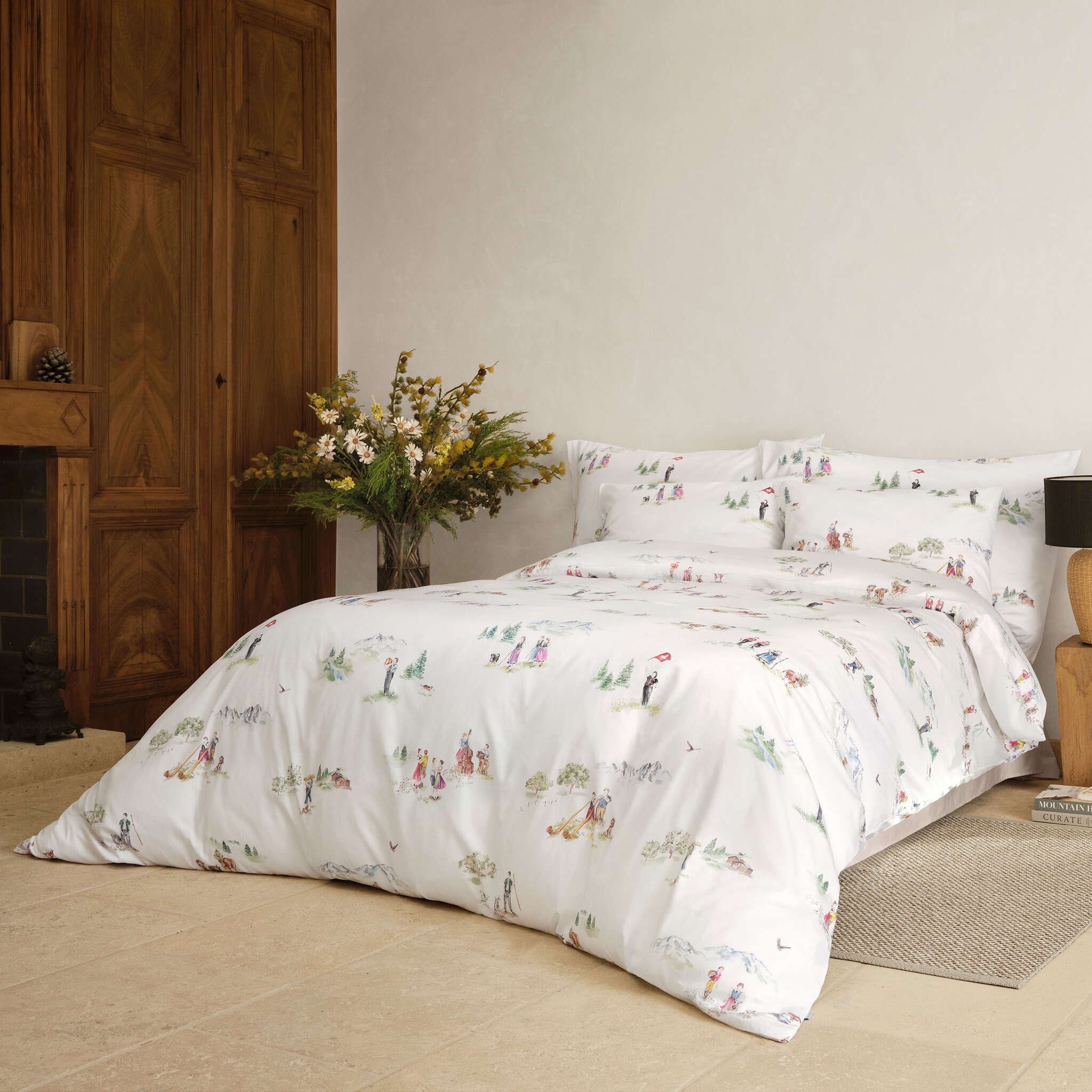 Have you already discovered all the narrative details in this little alpine summer story? How diverse the Swiss summer mountain world presents itself – adorned with the most beautiful meadow flowers, the alpine parade sets off, the sounds of the Alphorn players can be heard far down into the valley above the colorful hustle and bustle, can the flag-waver throw his flag any higher? Lush meadows as far as we can see, with only the white peaks rising into the blue sky, we enjoy this refreshing colorfulness just as much as the happily jumping young animals. This illustrative landscape appears almost infinite on the white sateen, and a new story can certainly be discovered night after night.