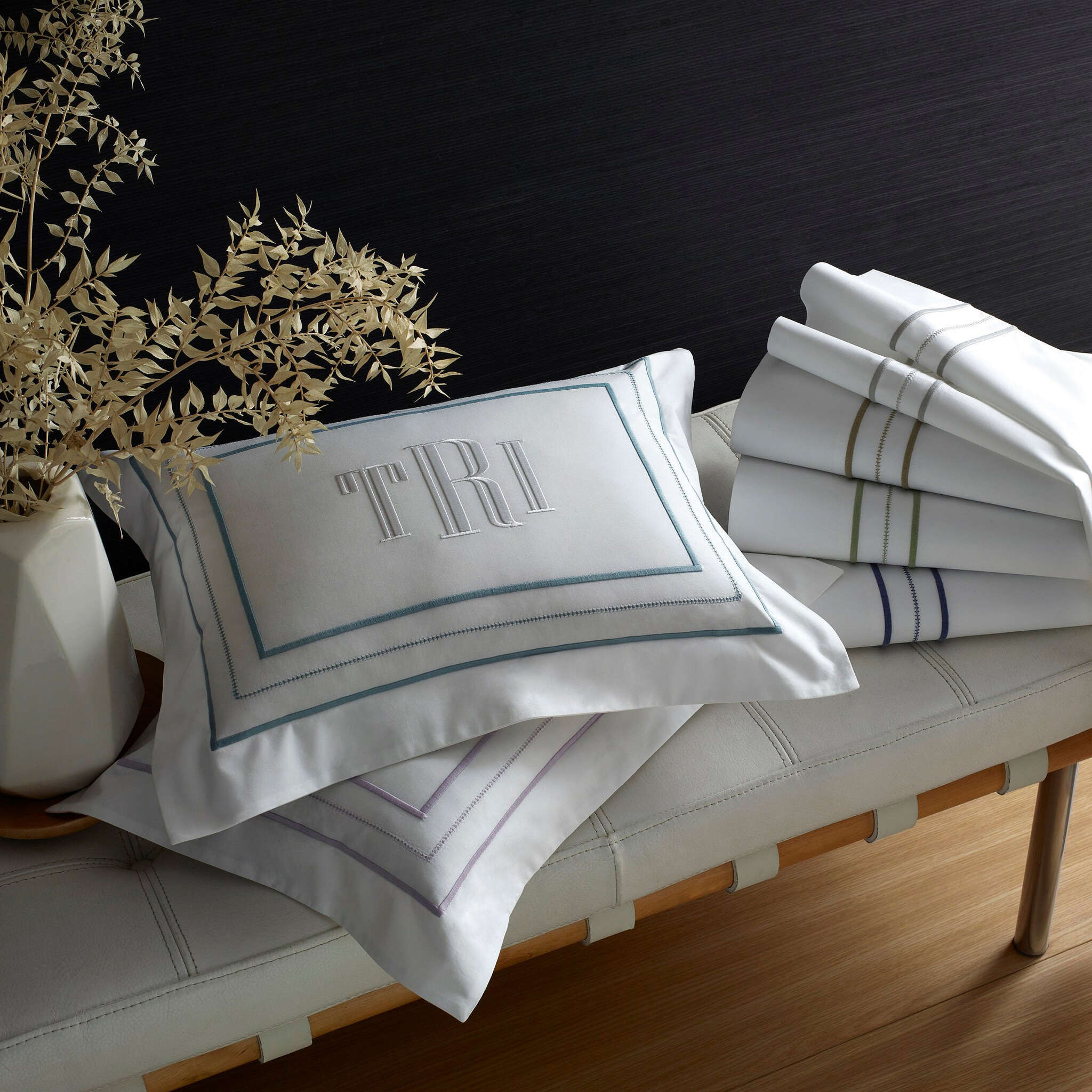 A monochromatic trio of embroidered satin stitch and hand-guided hemstitch that grace this Italian percale offer a simple, elegant and refined finish.