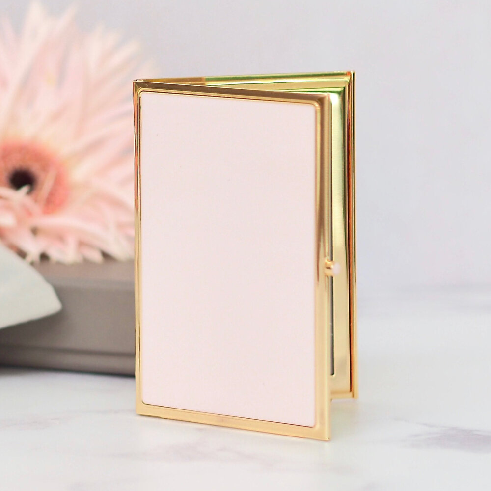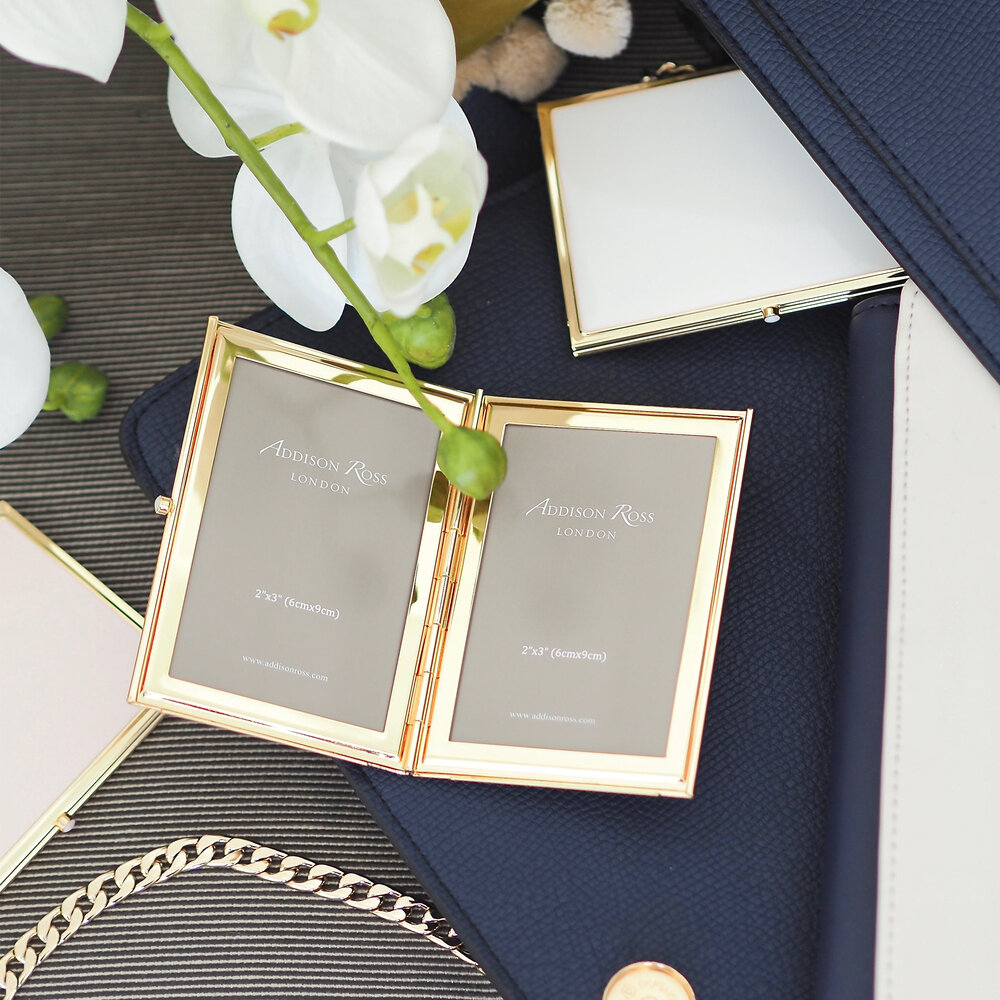 Show off your favorite photos on any occasion with this elegant and pretty purse and travel frame. Holds two 2x3 inch photos in a white enamel case finished in gold or silver plate.