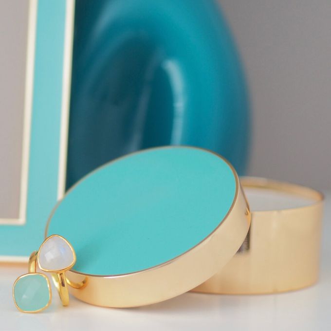 This incredibly pretty little enamel trinket pot is lined in soft stone coloured velvet. Finished with gold plate, with a fully removable lid, it is suitable to store jewellery, bedside or desk top bits and pieces.