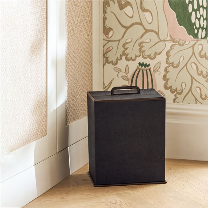 Introducing our partnership with Sophie Paterson, revealing a sophisticated waste paper bin. The bin includes a removable lid to discreetly conceal untidy rubbish, adorned with elegant bronze-colored metal accents.