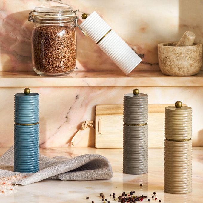 Our collaboration with Sophie Paterson presents the exquisite Reed Salt or Pepper Mill, crafted with a luxurious wooden body, including an elegant antique brass metal trim. Featuring a versatile grind adjustment, these mills offer precise seasoning control for both coarse and fine textures.