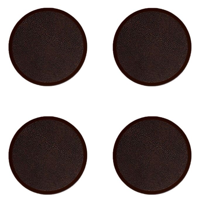 Clean shagreen geA set of 4 exquisite shagreen coasters, elegantly edged in bronze coloured metal trim. The base of each mat is covered with luxurious velvet to avoid scratching surfaces. Comes with a matching shagreen box with lift-off separate lid and cream velvet lining.