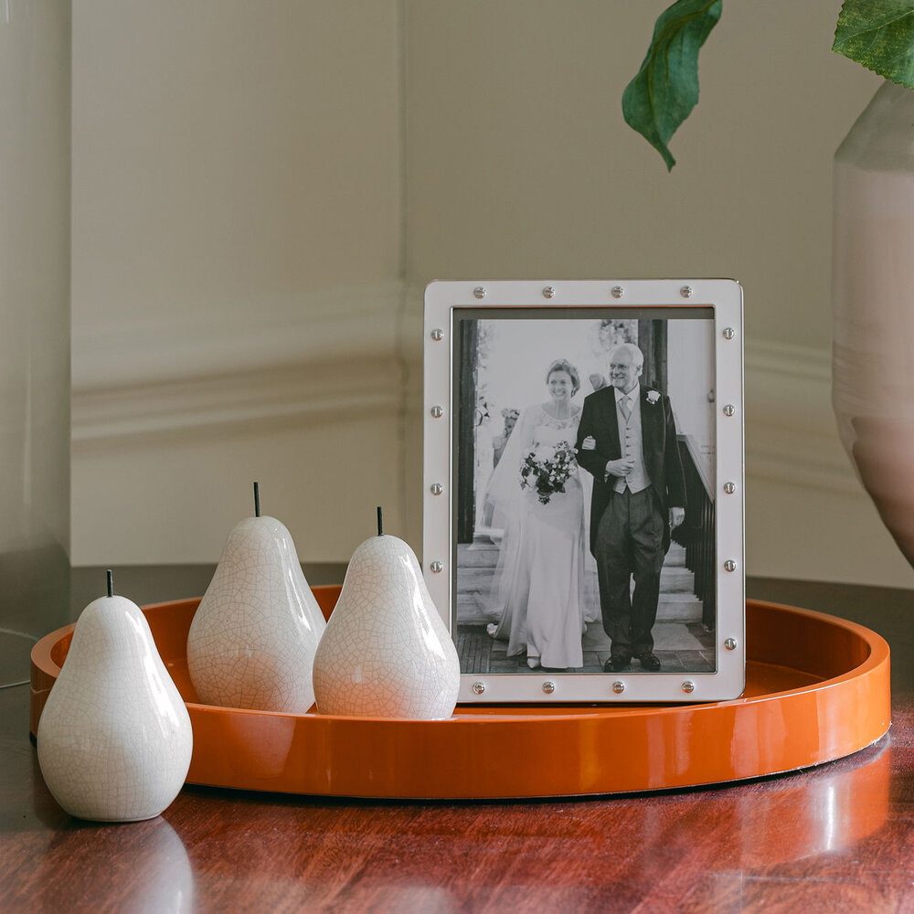 An elegant round lacquer tray suitable for serving or styling. Each tray is made from wood coated with 20 coats of high gloss lacquer, hand polished between each coat. The base is painted black satin and embossed with our logo.