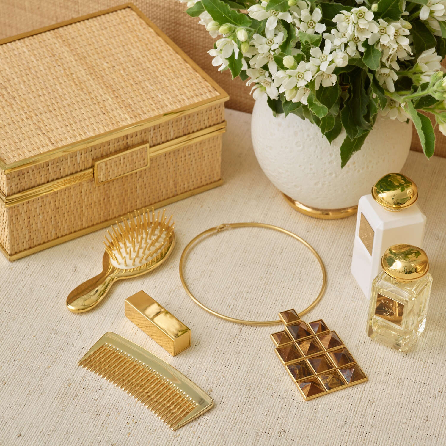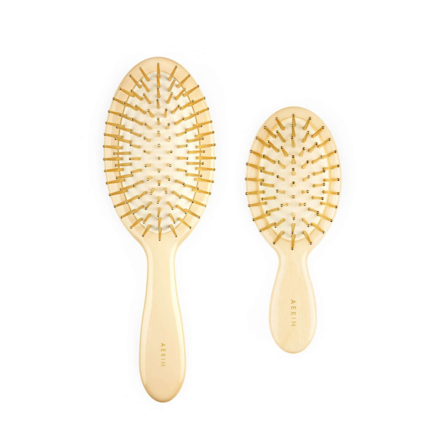 This gold hairbrush is a smaller version of AERIN's classic brush with gold-tipped ivory bristles that work well for all hair types. It is lightweight and is the perfect size for effortless style and a hint of luxury when you are on the go. Acetate, Galvanized with 24k Gold