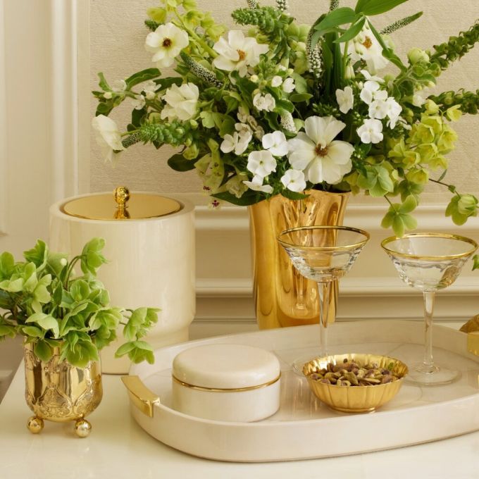 Inspired by Art Deco design, AERIN’s Livio parchment serving tray is crafted from leather panels, giving it an appealing geometric appearance. The creamy, semi-translucent finish is subtly different in each piece, which is further elevated with integrated brass handles. This versatile style works in both contemporary and traditional interiors as a stylish base for small home bar or for books and objets d'art on a coffee table.