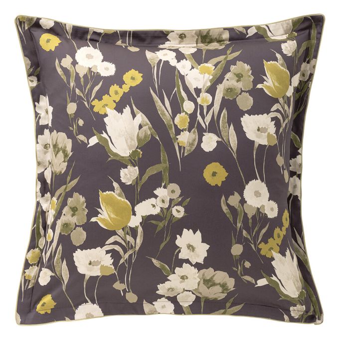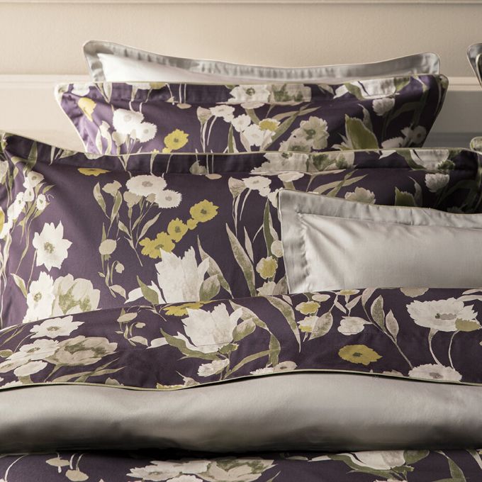 Inspired by Empress Eugénie and the decorative arts of her time, Closerie displays a sumptuous bouquet against a dark and mysterious background. Its large, hand-painted flowers combine tulips and cosmos in luminous shades of beige, gold, and khaki, offering a striking contrast with the deep purple background. The ensemble is enhanced by gold piping that highlights the richness of the pattern. The plain beige "gazelle" on the reverse calms the floral intensity for a bedroom of assured refinement.