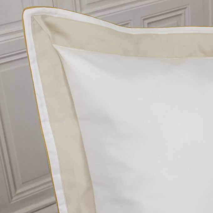 Pillow Sham: Plain dye body, Frame made of a 2,15’’ flange with 1,75’’ appliqué tape, mitred corners, braided piping, plain dye in the back, single flap.