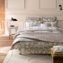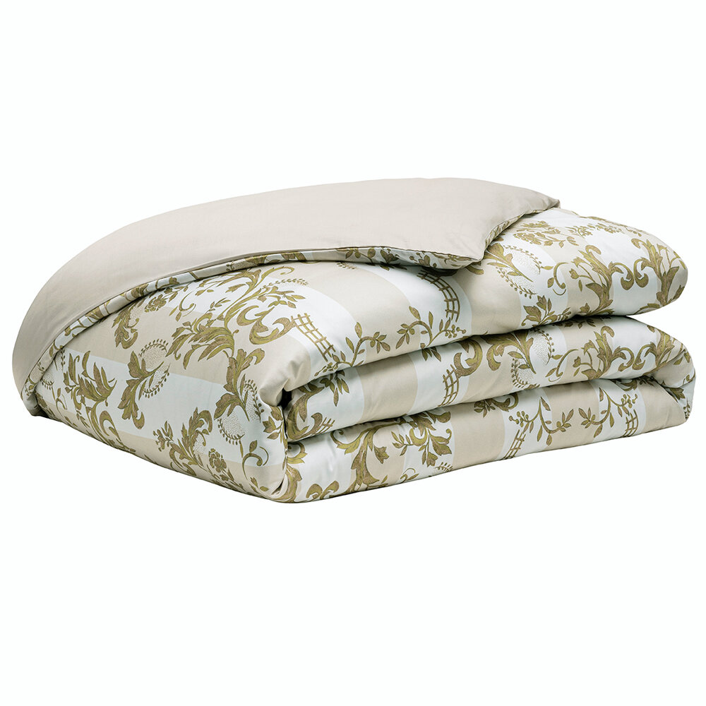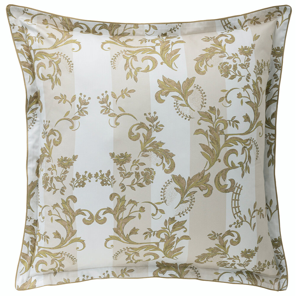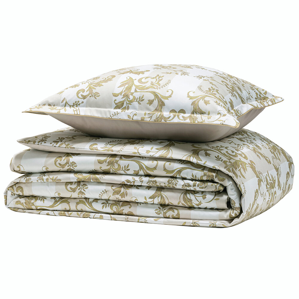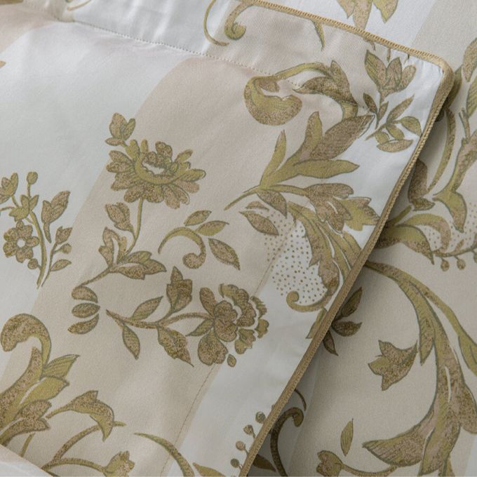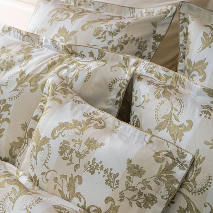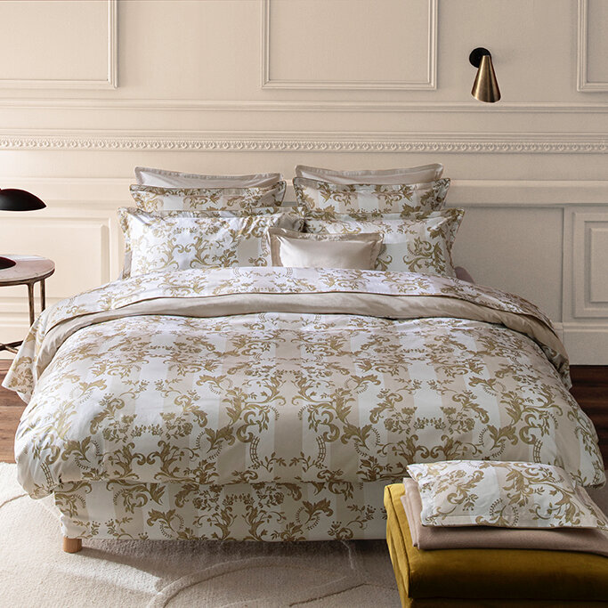 The Opera bedding set pays homage to the splendor of the Palais Garnier in a soft and luminous version. The Opera set is inspired by the ornamental decorations of the Napoleon III style. Acanthus leaves, micro-patterns and wide stripes unfold majestically in an elegant palette of warm white, pinkish beige and patinated gold. The design, entirely handmade, evokes the stucco, woodwork and mirror frames of the period. The plain "moon" satin reverse adds a touch of soothing softness. The "desert" piping ribbon frames each piece with a subtle golden sheen, for a refined and timeless style.
