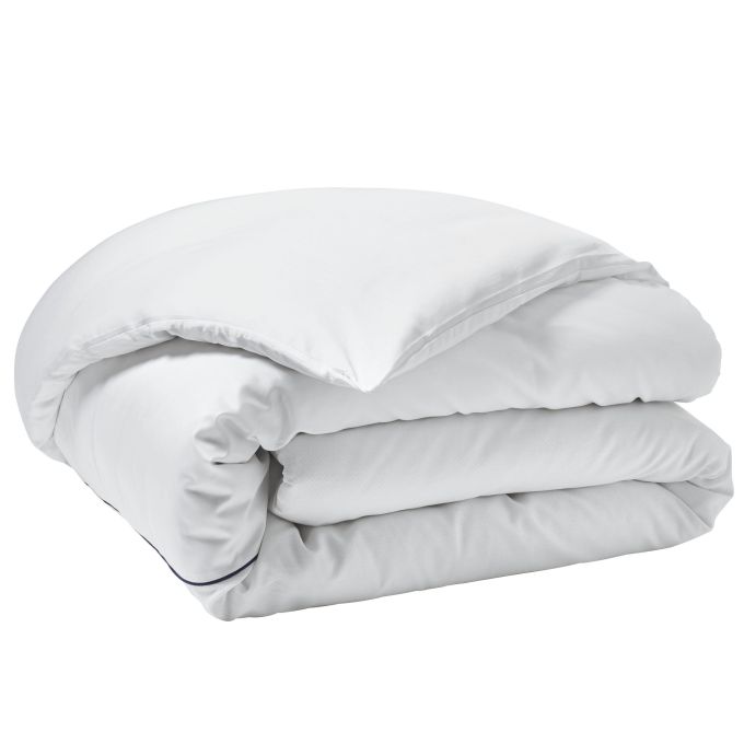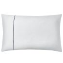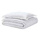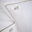 The combination of an ultra soft and silky snow satin and a micro pattern with a guilloche effect, woven on a jacquard loom, gives a pleasant play of texture, for a simple and effective product. The seduction of this classic style comes from the contrast of materials (the texture of the jacquard and the silkiness of the satin), the contrast between the colour of the ribbon and the purity of the white linen. The simple and careful manufacture of the duvet covers and pillowcases gives the advantage to the jacquard, while the back is in white satin.