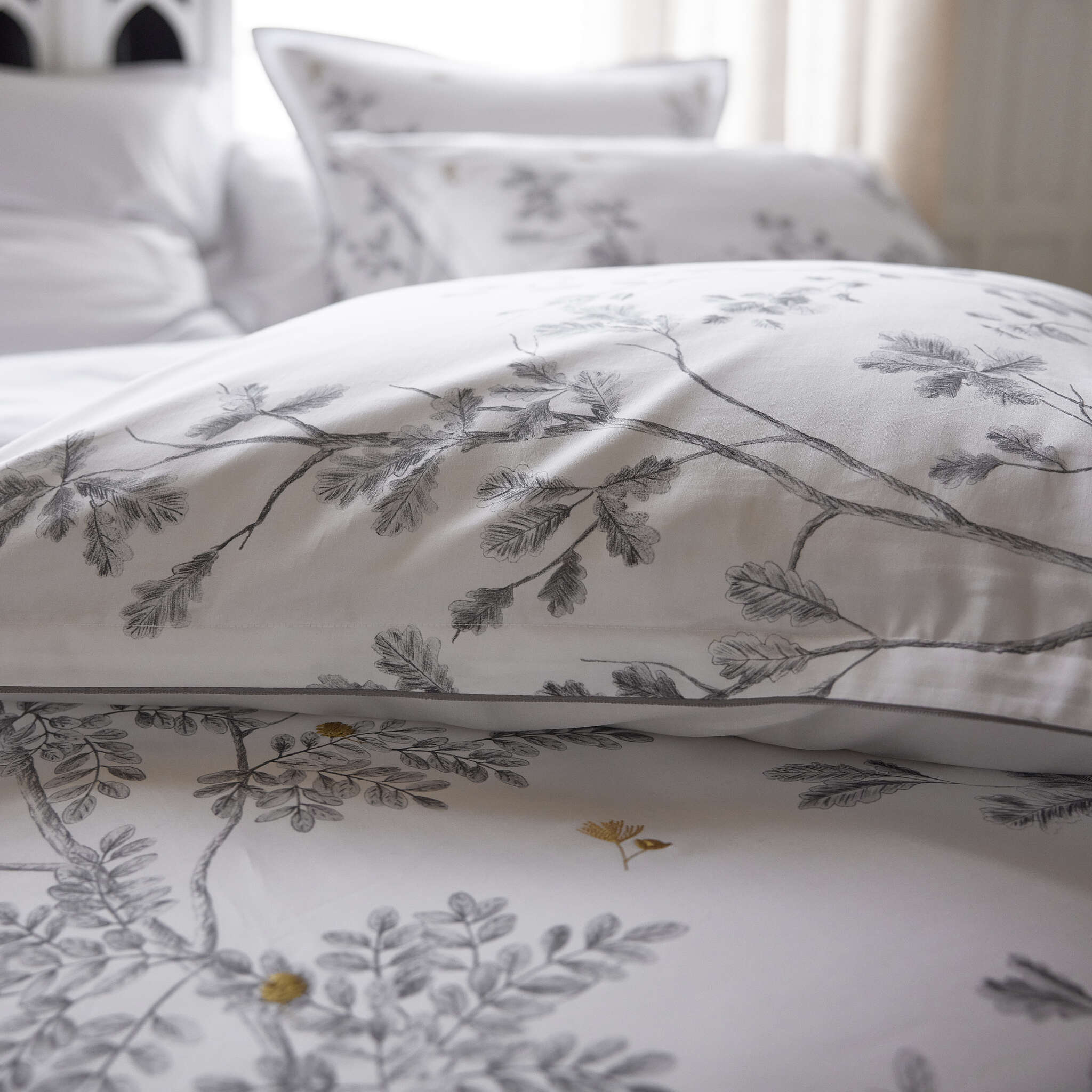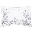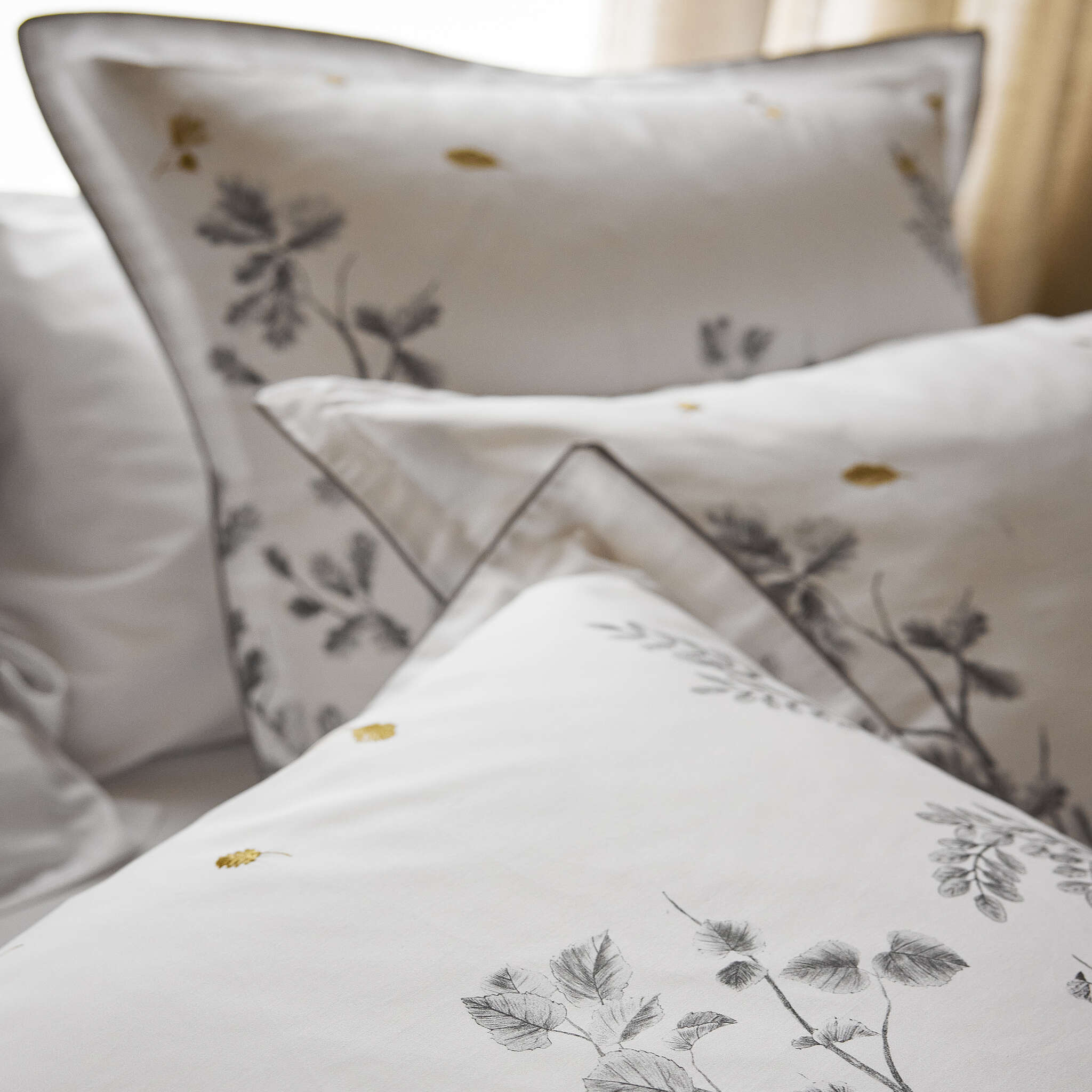 With Saison, we invite you into the sophisticated universe of 18th century French gardens. In this panoramic drawing, a majestic driveway lined with spindle trees stretches before your eyes. Each sheet, drawn by hand in line and ink, comes in a sober palette. From black to white to silver gray gradients, the whole is of a striking depth. A set magnified by delicate embroideries in bronze threads. Seeming to sway in the air, these patterns contribute to the beauty of this pillowcase and its very couture look.