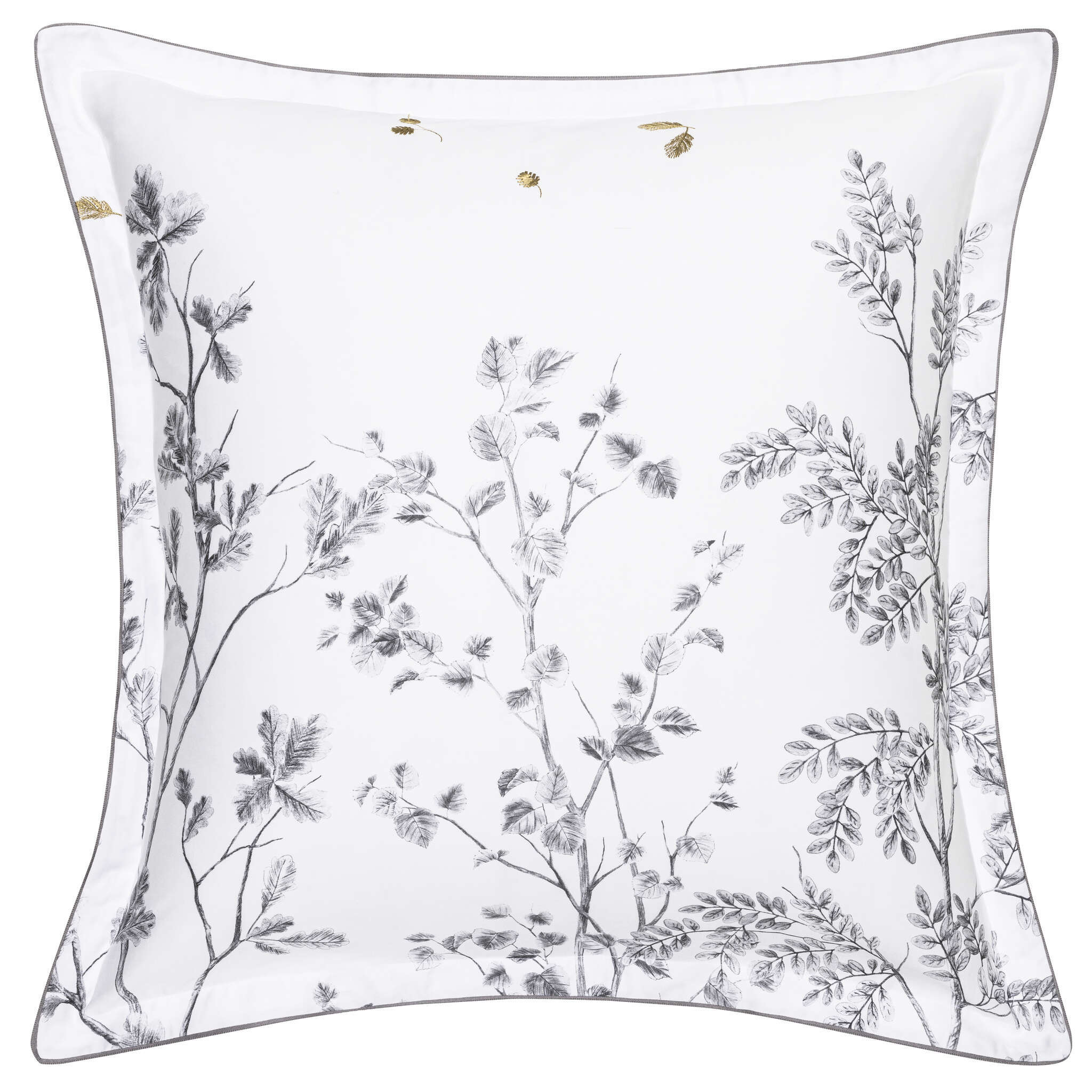 Sham: "French hedge garden" printed pattern with engineered "leaves" embroidery in front reversing to plain dye sateen. 1,18" flange, organic cotton satin ribbon pipping, double flap.