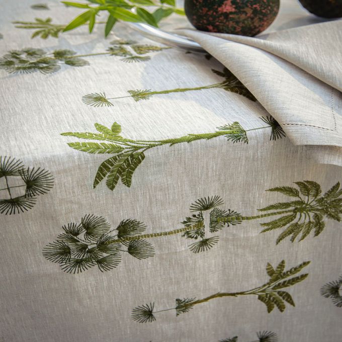 Discover our plain tablecloth BARBADE in embroidered linen ! The desire for a lush exoticism tempered by the constraints imposed by the embroidery on our beautiful natural linen. The very graphic designs of different kinds of palm trees and palm plants such as the traveller's tree are particularly well suited to this decorative technique. This model emphasises the choice of very different stitches to give body, style and relief to the relatively classic palm and palm plant motifs. The choice of rhythm and the head to tail or head to tail positioning of the motifs, the hybridisation of certain details to create a new pattern, which contributes to creating a truly modern and differentiating visual.
