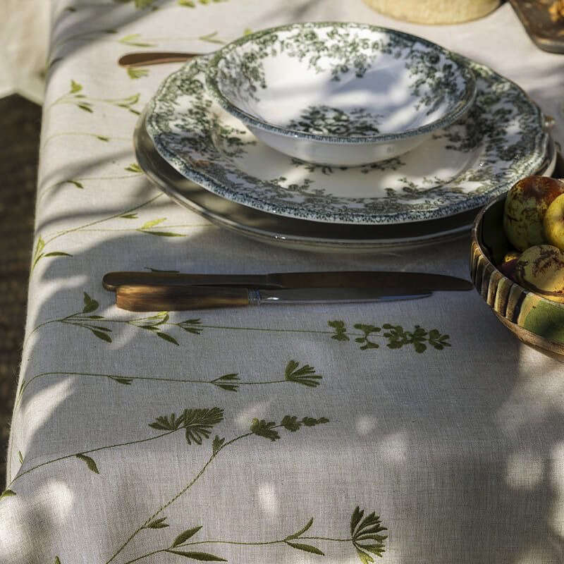 The INFUSION tablecloth is adorned with woody and vegetal tones and blends in with the surrounding nature. A few wild grasses stretch along the edges of a beautiful French linen fabric and rise up to the tabletop. The slender, hand-drawn pattern is translated into richly detailed embroidery stitches. This artistic work only reinforces the sober and luxurious look of this high quality tableware.