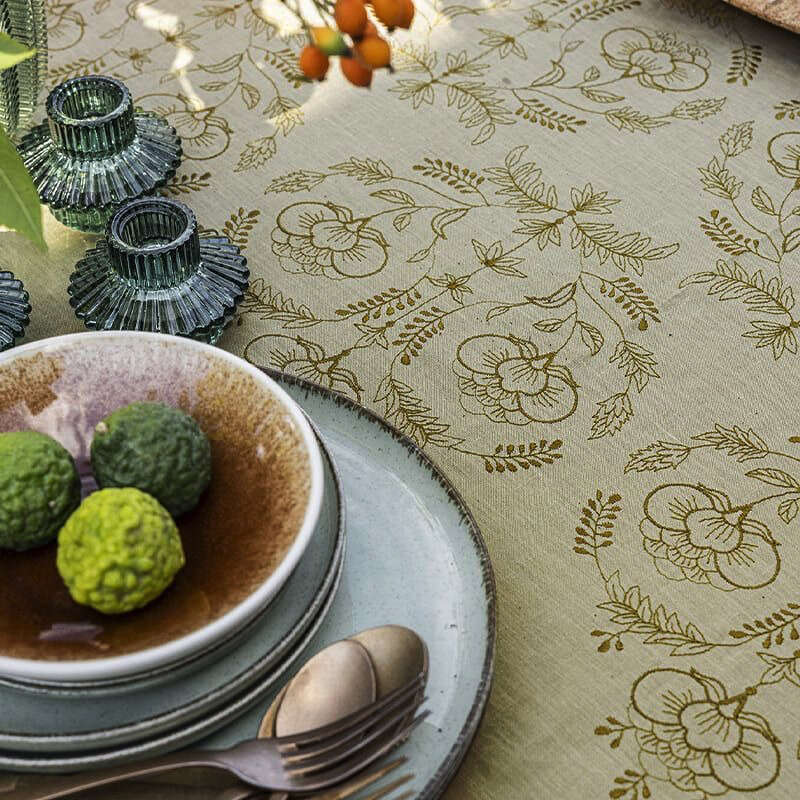 Reflecting the decorative richness of the ancient Orient, Paradis is adorned with large heart-shaped medallions and Persian-style stylised flowers. The arabesques enclose beautiful roses surrounded by foliage and wisteria flowers embroidered in throw stitch in the centre of the tablecloth. Graceful and light, this garden-of-paradise-style design stretches across a coloured fabric, chosen to bring out the contrast of the embroidery. This design is our elegant declaration of love for nature.