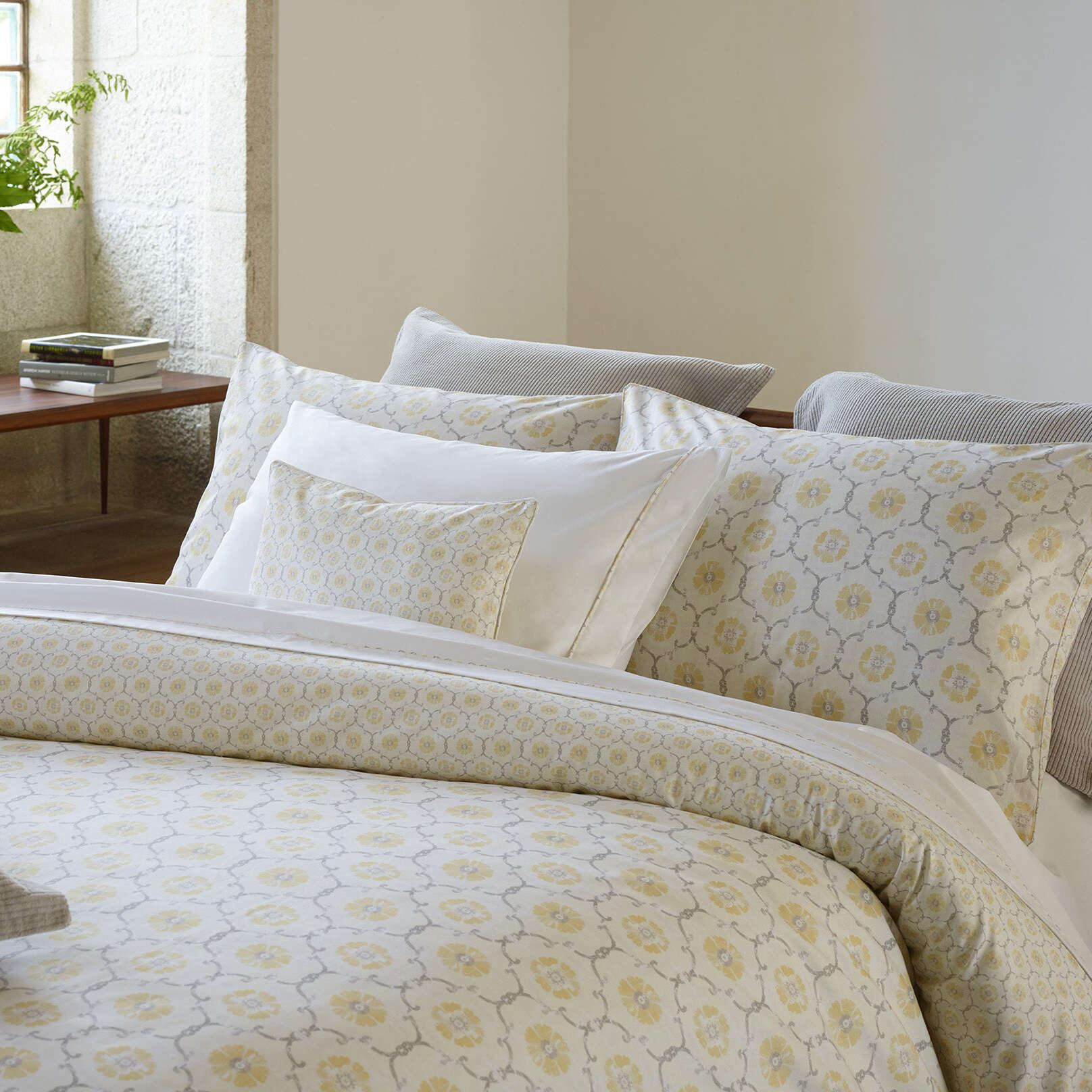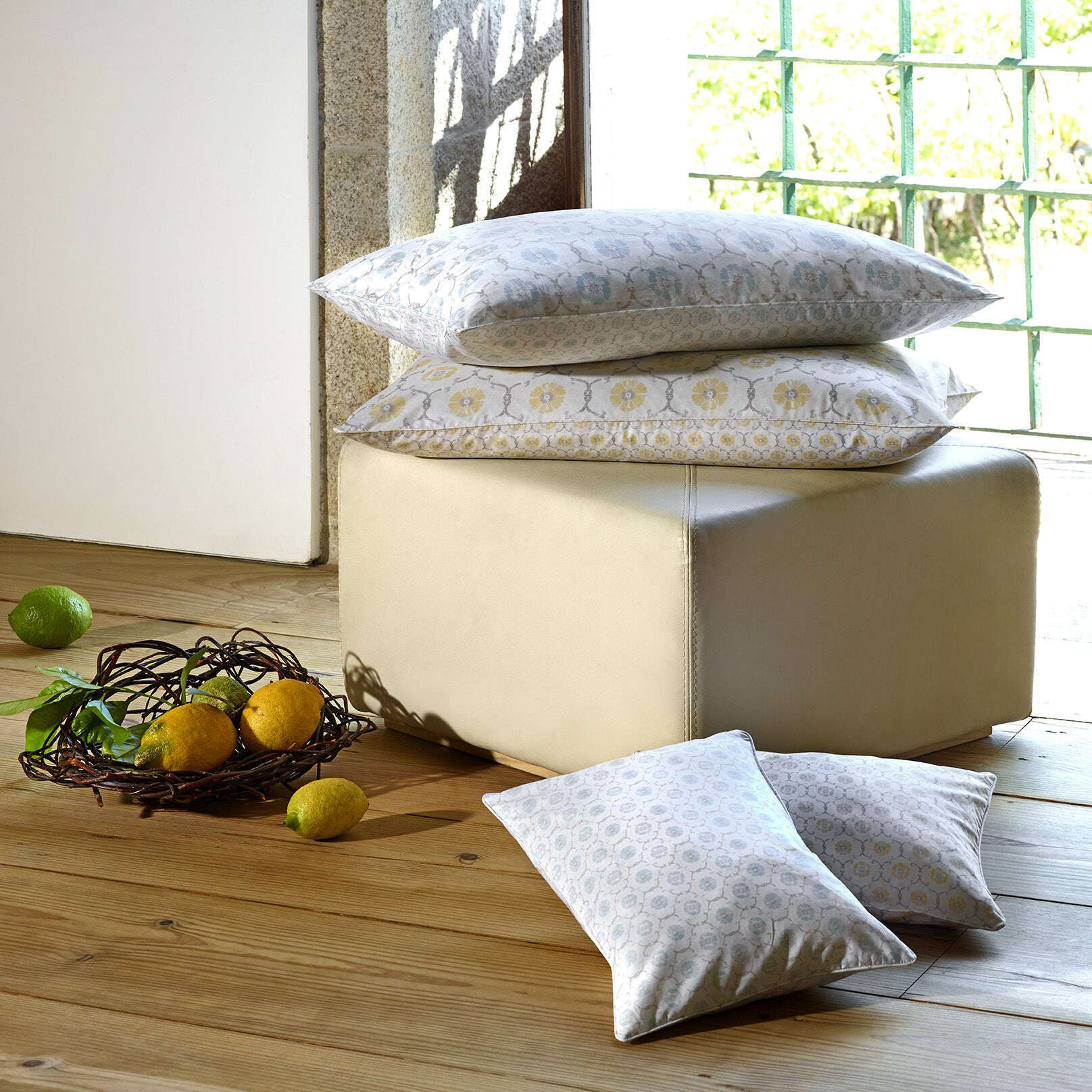 The delicate flourishes and florals of this pattern were inspired by the romantic beauty of the palace and gardens of MONSERRATE, on the northern coast of Portugal. Fully reversible, it’s a versatile way to add poetry and a touch of nature to your home.
