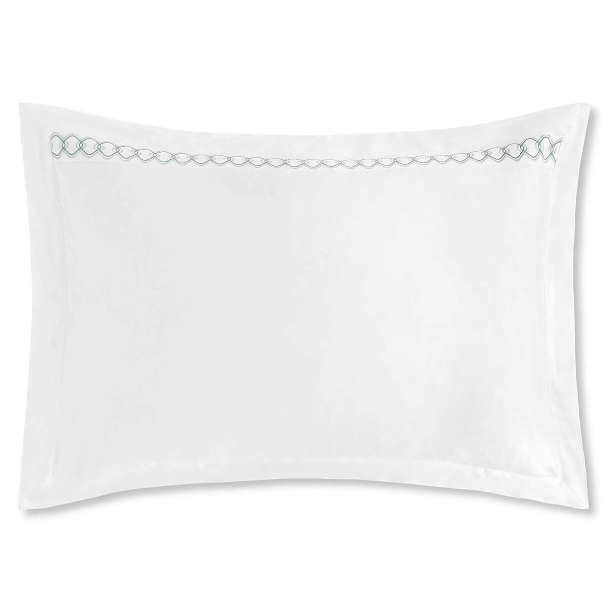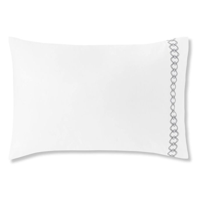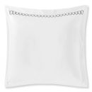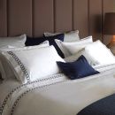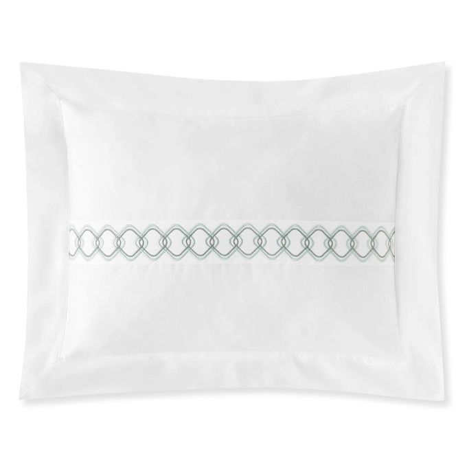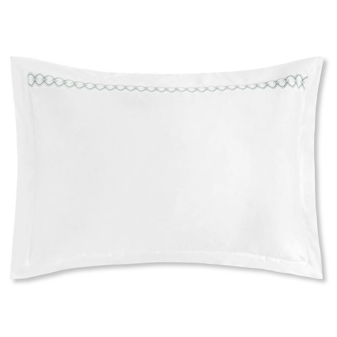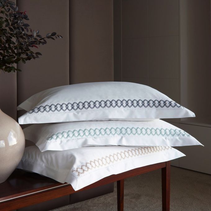 Sham (Oxford pillowcase) and euro sham (square pillowcase) with applied embroidered border at the top and flange on four sides.
