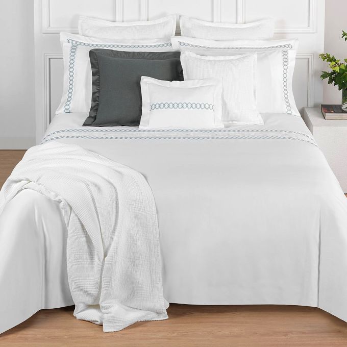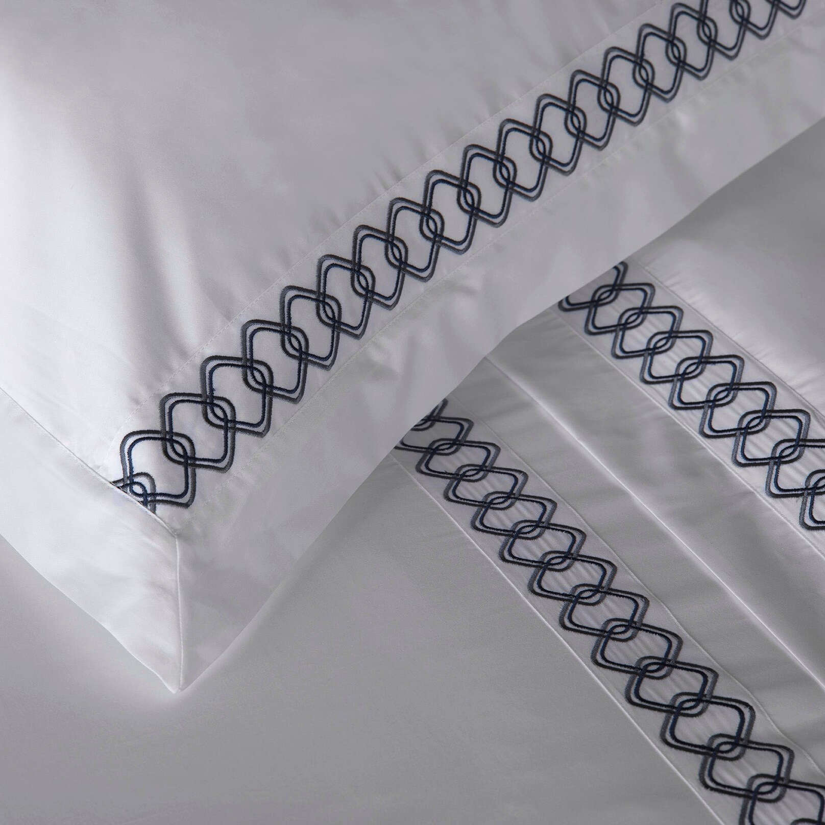 Our Ornato design is a prime example of Amalia Home Collection’s dedication to sophisticated design and top-notch comfort. Elegant, interlocking diamonds are the hallmark of this collection, artfully embroidered onto a luxurious 430-thread-count sateen base made from 100% Egyptian cotton.