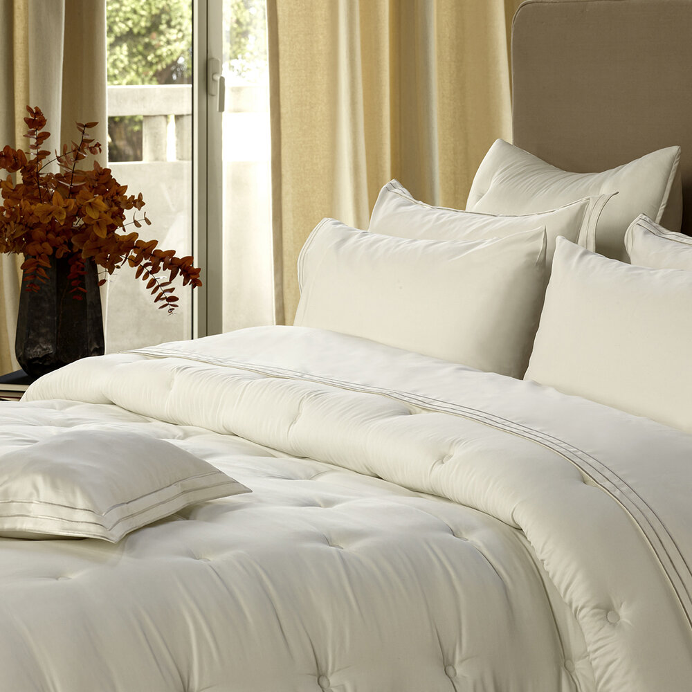 Our Savia Quilted balances softness and durability, a lightweight and sustainable addition to your bedroom, combining the gentle feel of bamboo with artfully crafted hemming that beautifully complements the quilt's delicate sheen.