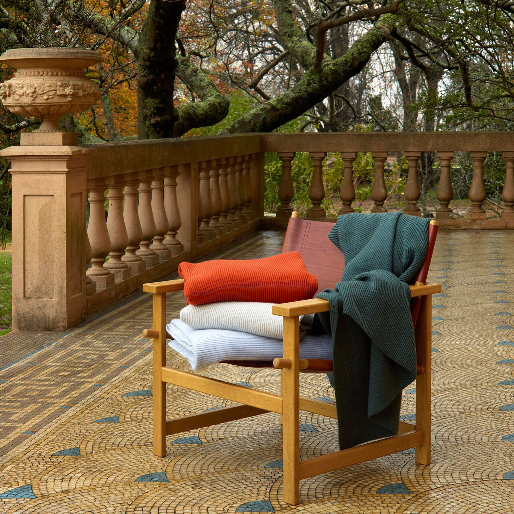 Wrap yourself up in the soft, lavish warmth of our Antónia Throw, woven from the highest quality extra-fine merino wool, silk, and cashmere.