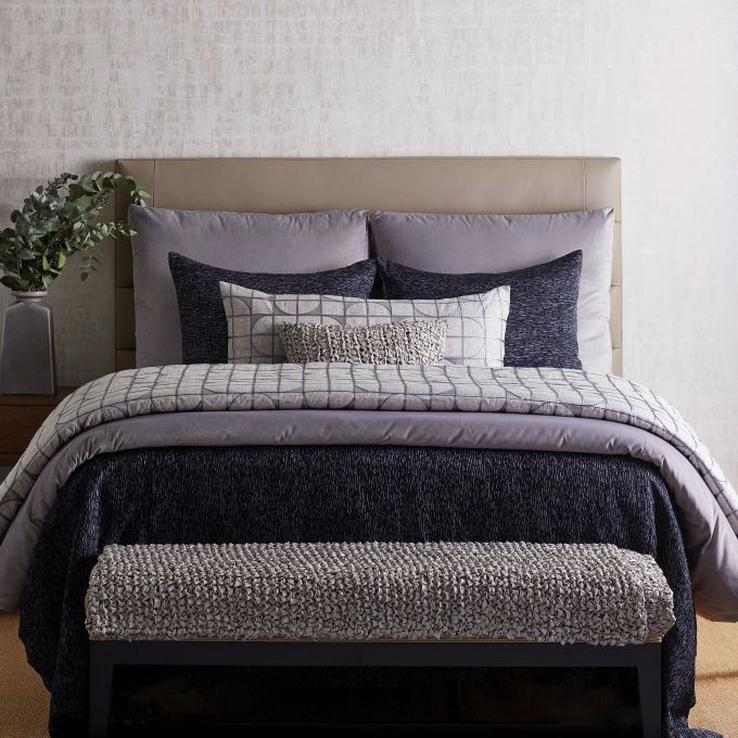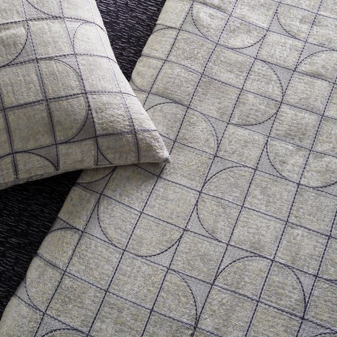 Soft grey, blue, and charcoal embroidery on a silvery jacquard with a graceful capsule design.