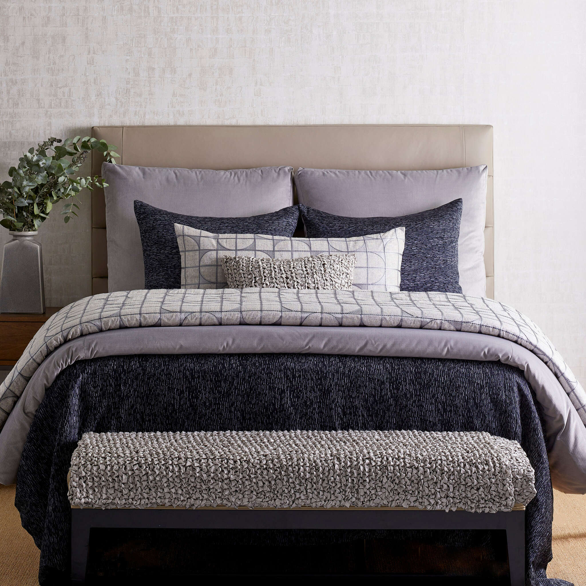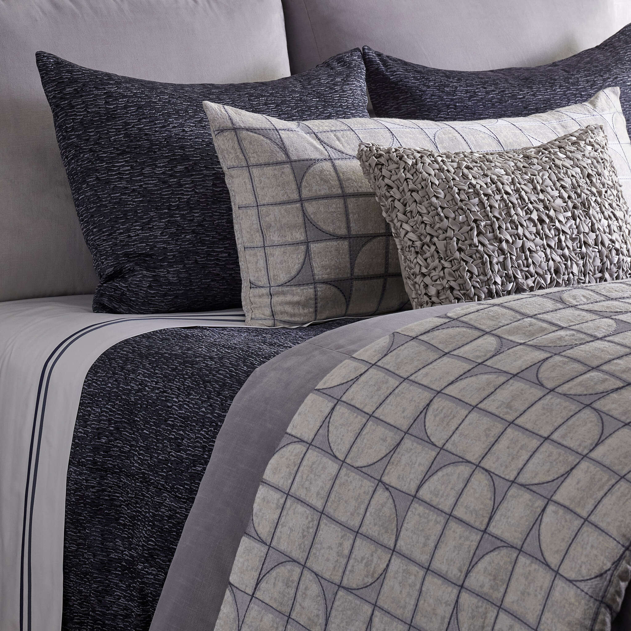 Soft grey, blue, and charcoal embroidery on a silvery jacquard with a graceful capsule design.