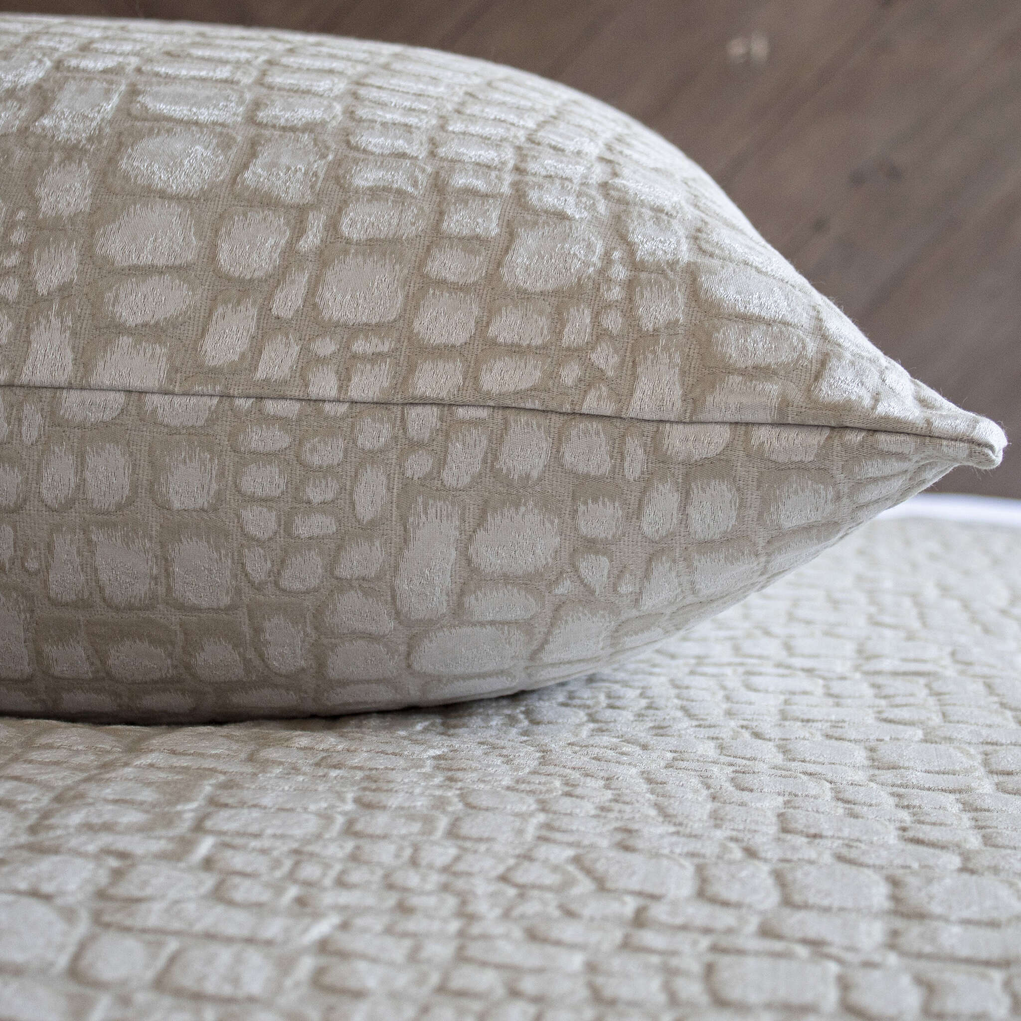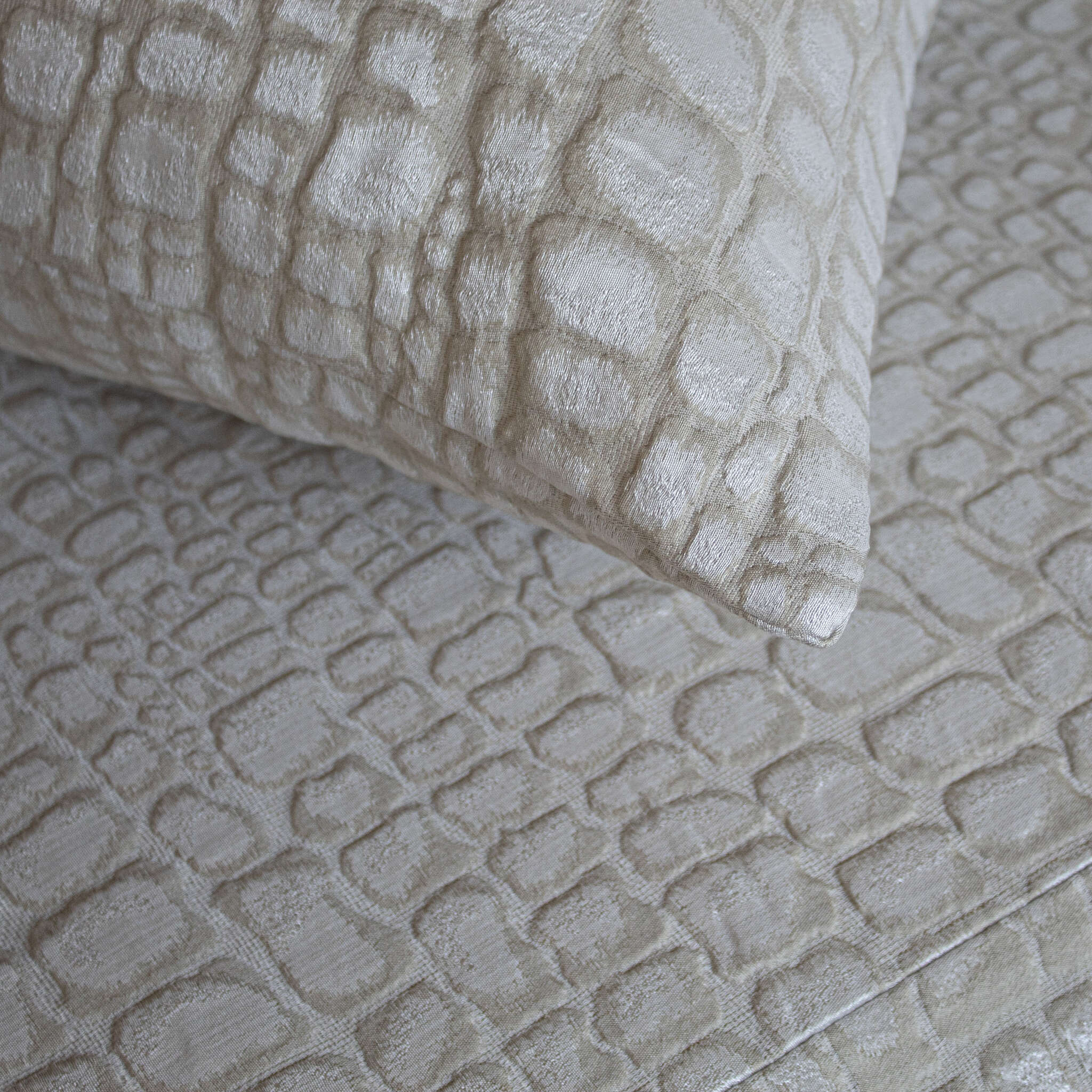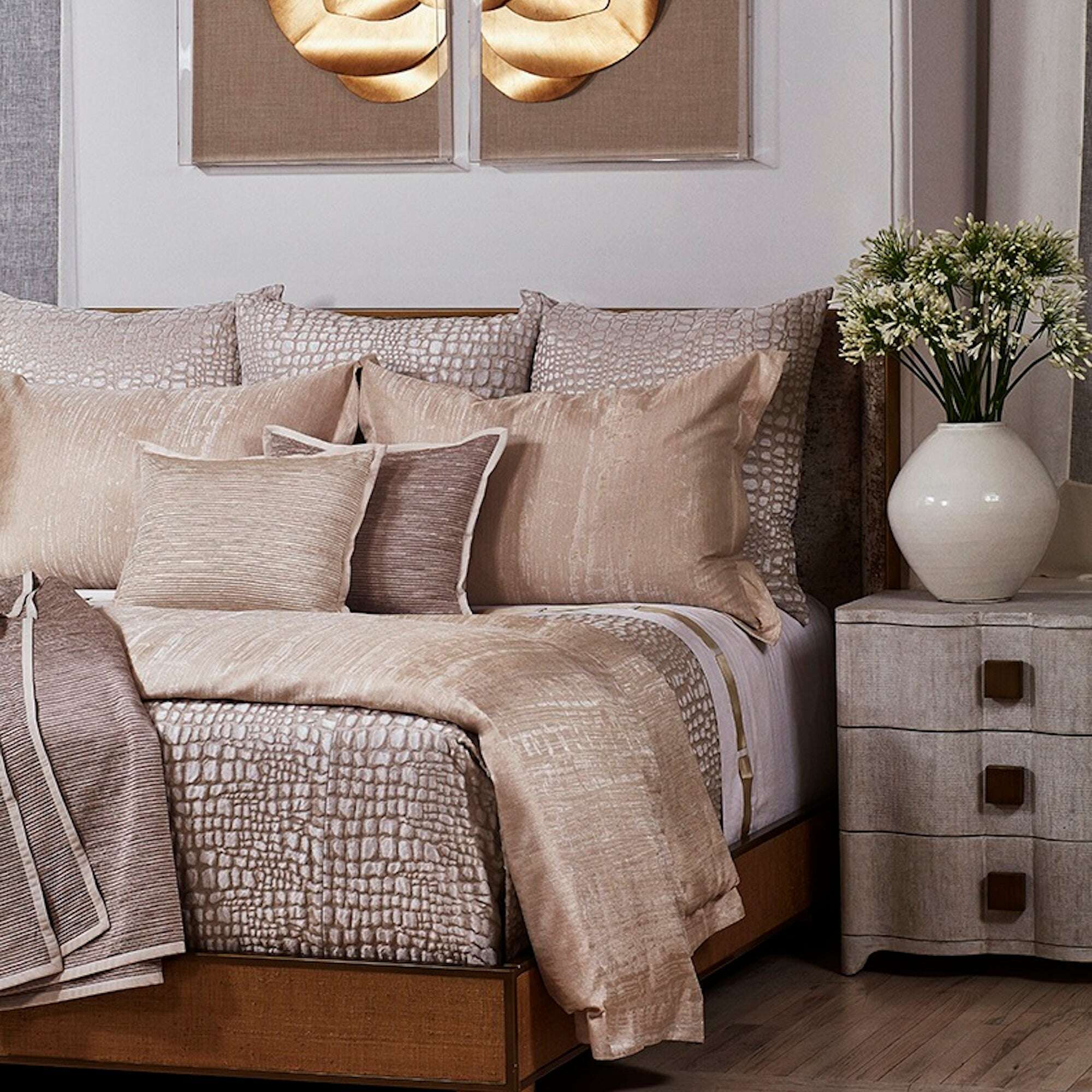 Inspired by luxurious leather handbags. This dimensional jacquard is beautiful and bold, despite coordinating with a variety of bedding collections.