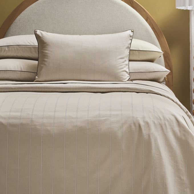 Pillowcases, flat sheets and shams are embellished with a charcoal coloured hand guided pipng detail.
