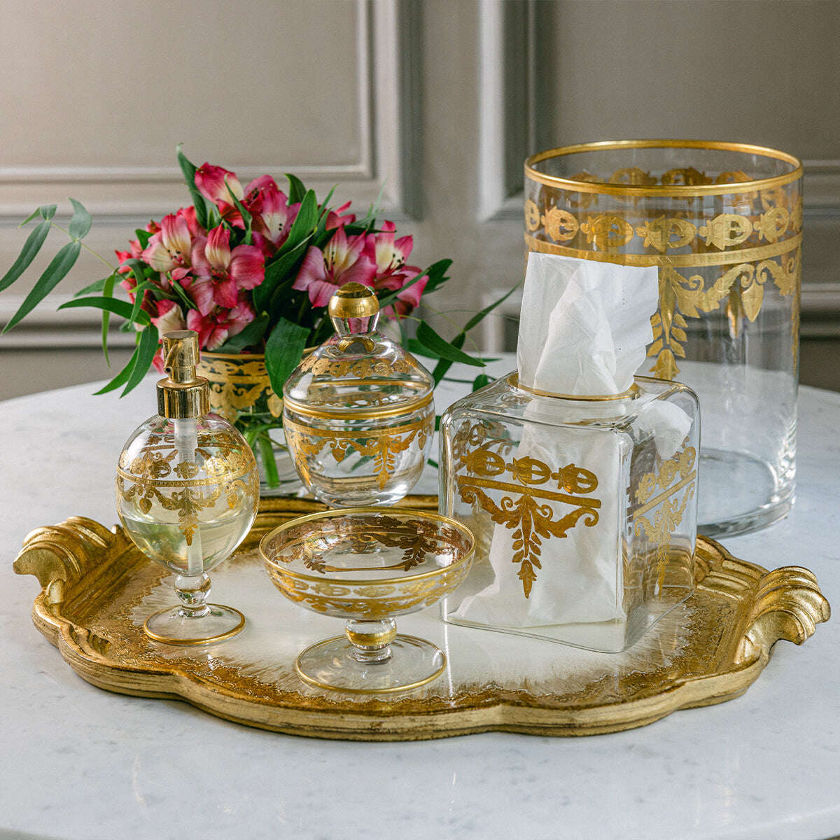 Our Vetro Gold Collection has been known to leave guests speechless. Florentine master artisans hand paint 24-karat gold highlights on intricate hand etched designs. The results are nothing short of extraordinary. One of our most popular collections. Hand made in Tuscany.