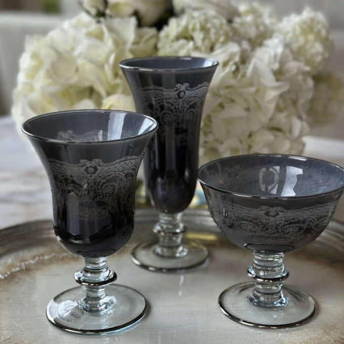 Taking its name from the historic market area of Venice, the Rialto Collection is the collaborative work of talented artisans across Italy. Mouth blown, white swirled glass with a marbled look is created by Neapolitan glass makers and then hand painted in Tuscany. The Rialto Borghese series enhances these pieces with an intricate Victorian design etched into the glass, lending an additional layer of elegance to the glassware.