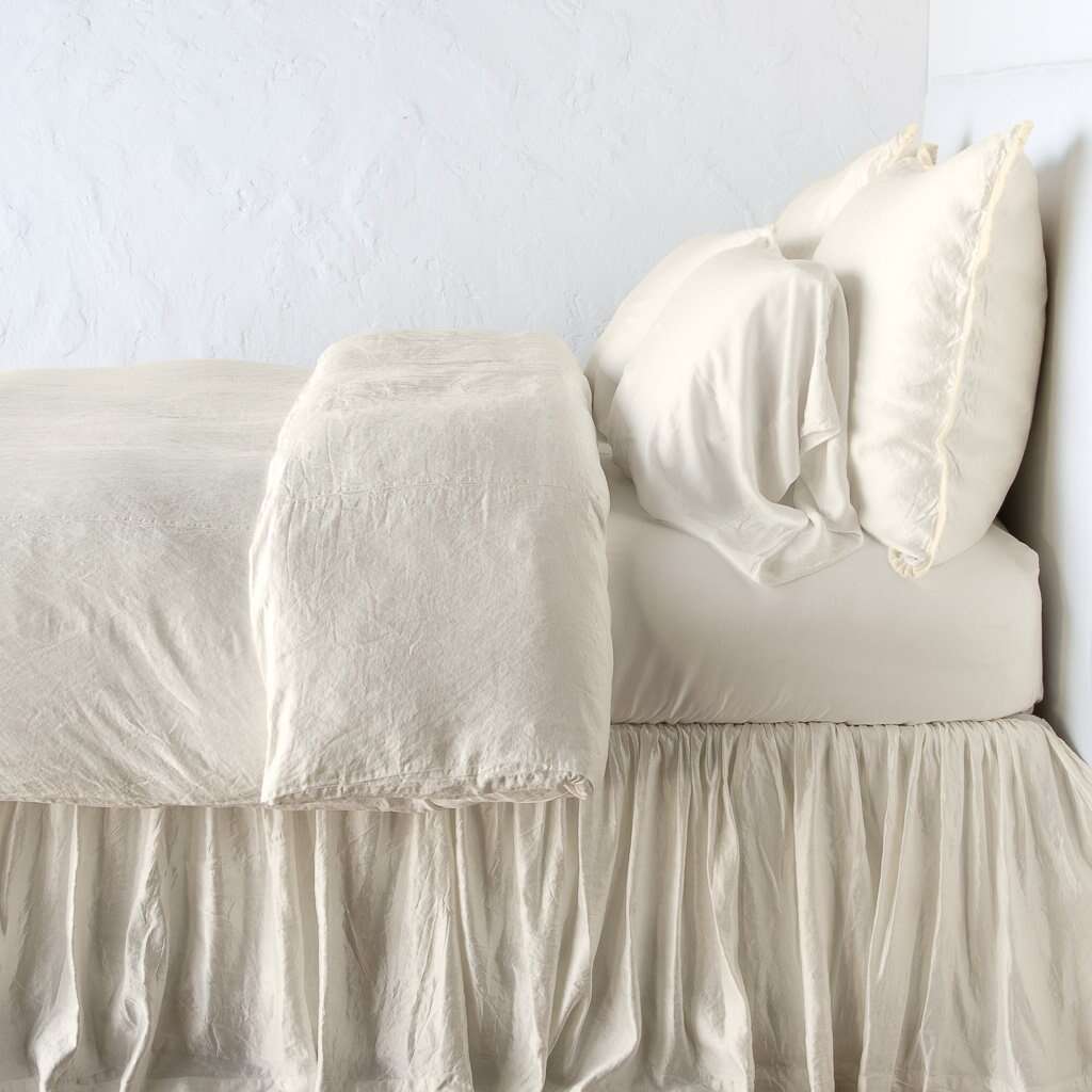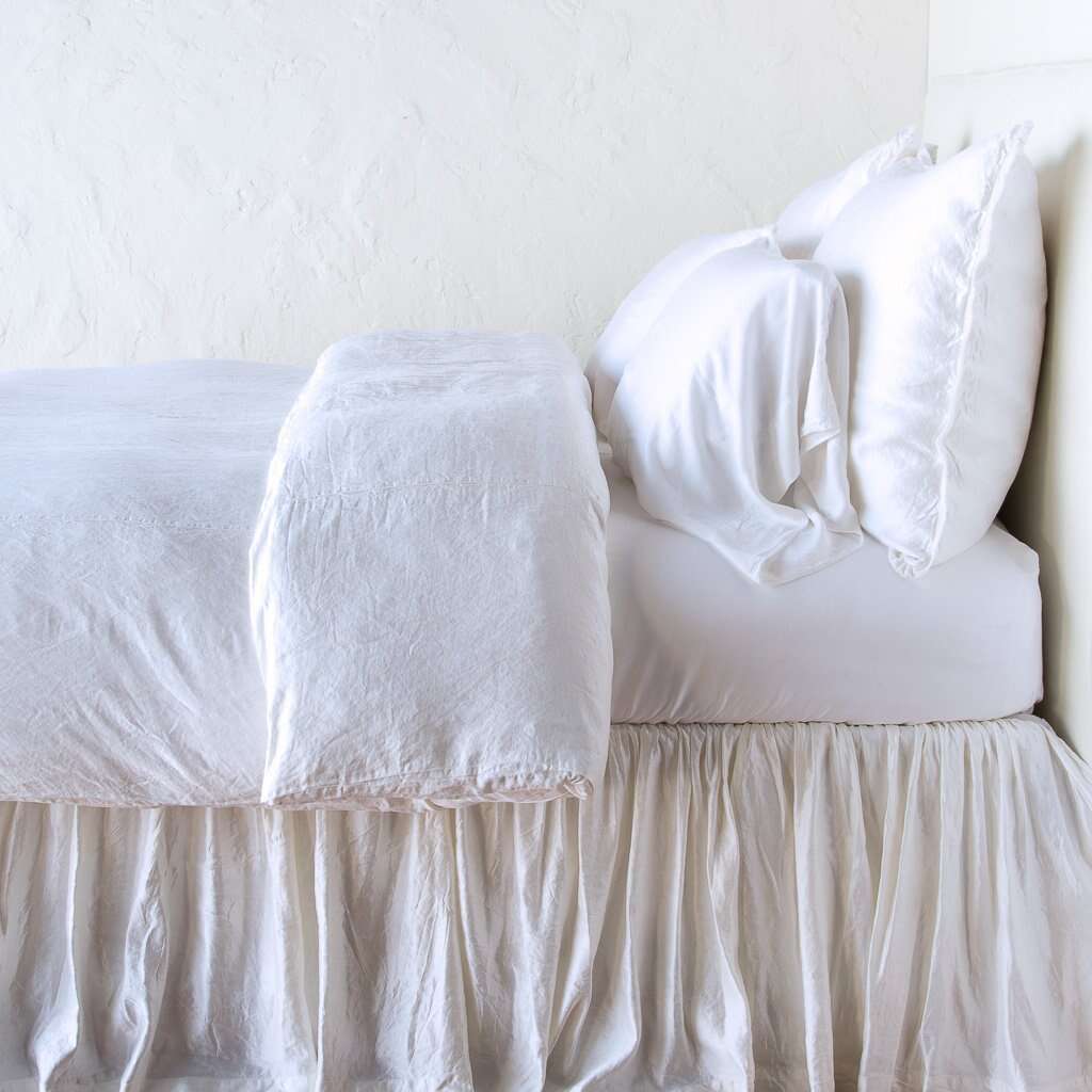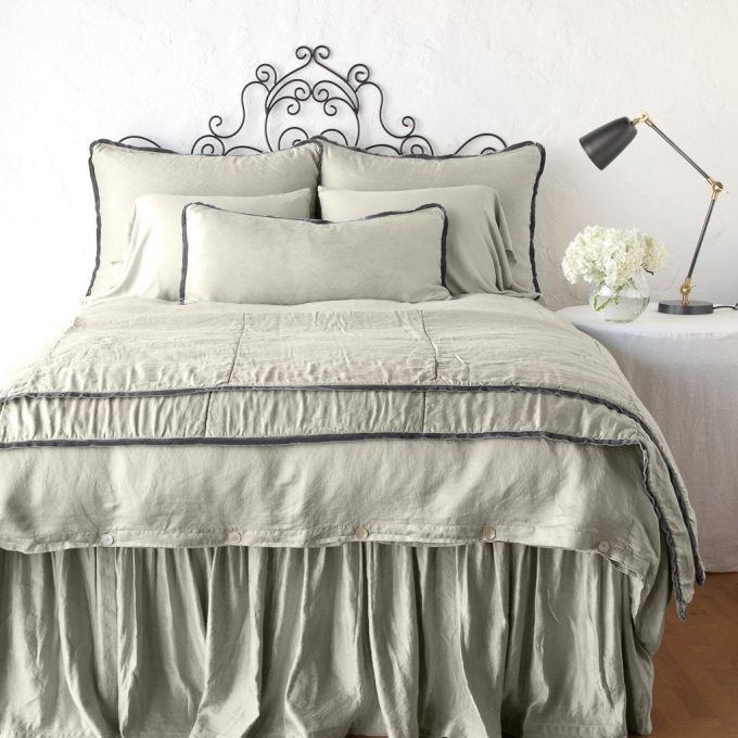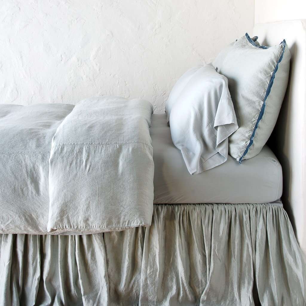 The Paloma is a vision of lustrous elegance. Boasting clean edges, this garment dyed piece basks in its own pearly luminescence. Backed in the same shimmering silk charmeuse and closed with our signature akoya shell buttons, allow Paloma to transform your bedroom into a brilliant dream.