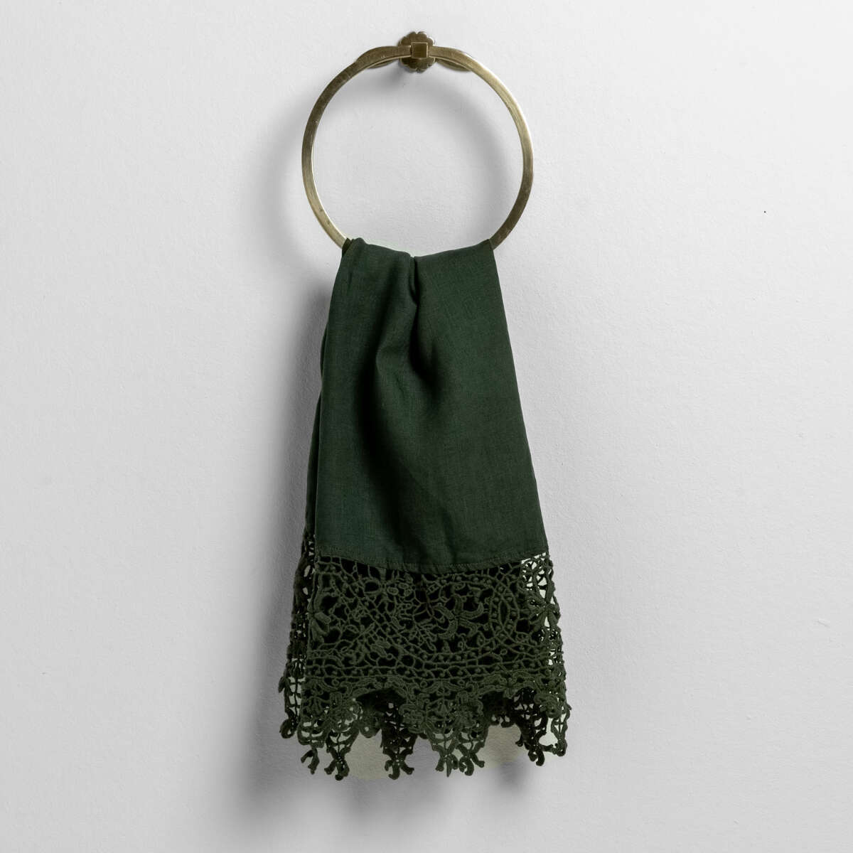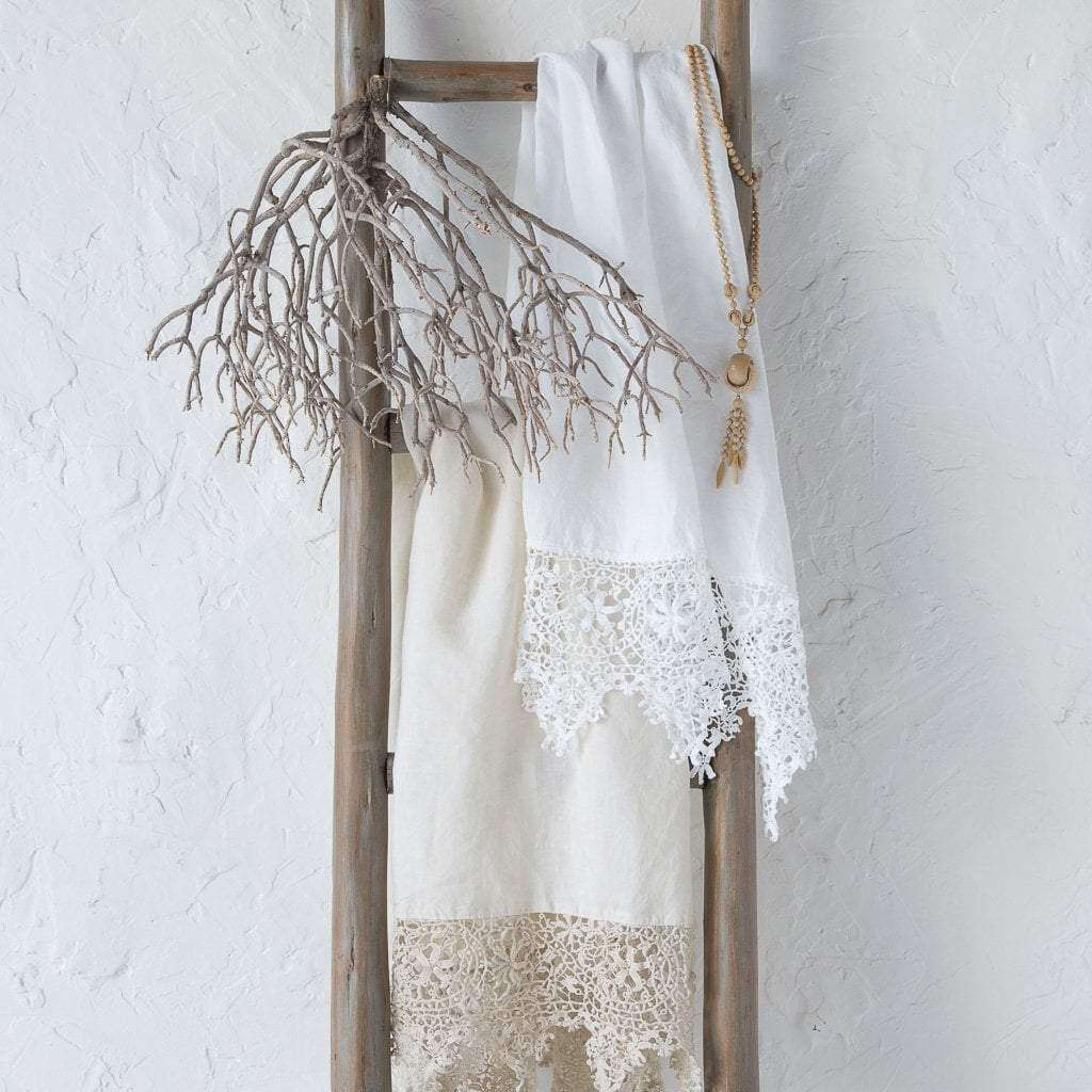 Graceful scallops of cotton lace trim each end of our Frida Guest Towel. An elegant keepsake, this garment dyed towel becomes more lovely with each wash and daily use. Fold over the bar in your powder room, or include beside an antique water carafe in your guest room for a touch of vintage glamour. All of our towels are designed with care, and make the most lovely gift for your favorite hostess or bride-to-be.