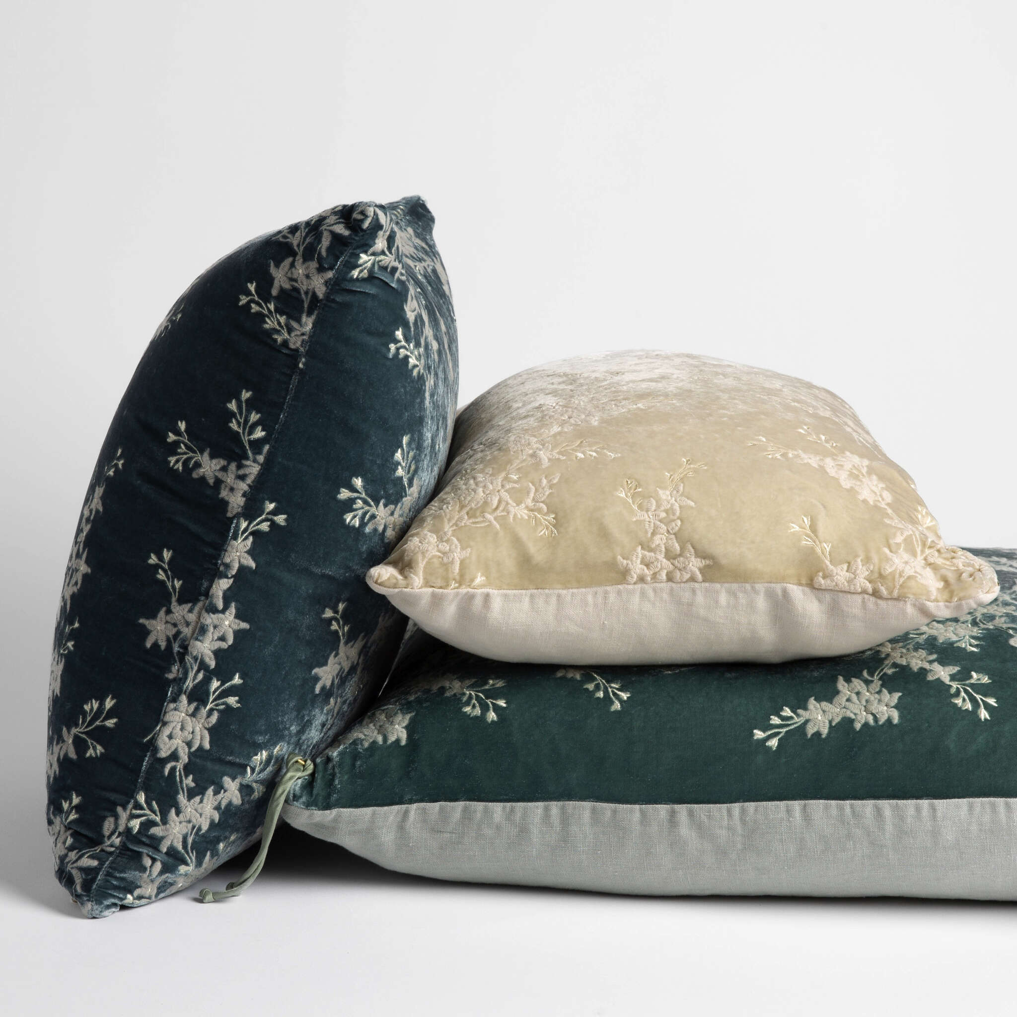 Designed in softly textured silk velvet, our Lynette Throw Pillows flaunt graceful floral embroidery with pale gold accents inspired by vintage chinoiserie. Available in five sizes and two styles, layer our Lynette pillows into your space for a luscious pop of old-world glamour blended with modern form. All reversible, the 18x18 and 16x36 are backed in the same fabric as its front, and the 15x24 and 24x24 styles are backed in midweight linen. The 9x39 bolster pillow has a modesty panel of Tencel™ a nod to our Lynette Luxe collection.