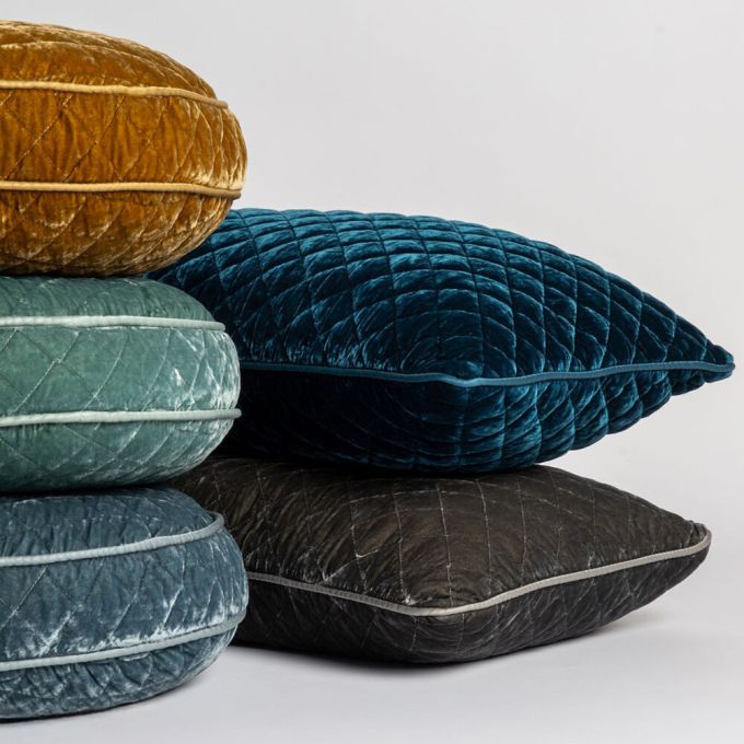 Plush and irresistible, our Silk Velvet Quilted Throw PIllows are absolutely stunning - true studies in textural excellence. Finished with delicate satin piping and offered in two shapes, these throw pillows easily adorn chairs, sofas, benches, and beds completing your picturesque space. Our throw pillows include a removable insert secured with our signature akoya shell buttons on our 16x36 size and a hidden zipper on our 18” diameter pillow.