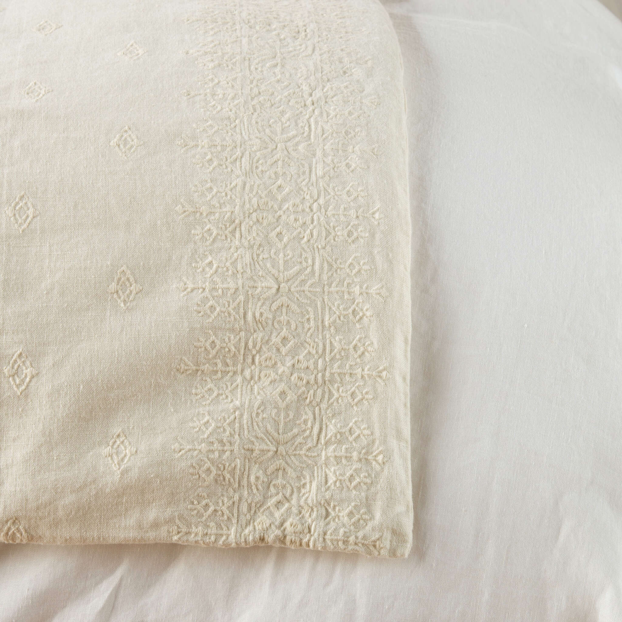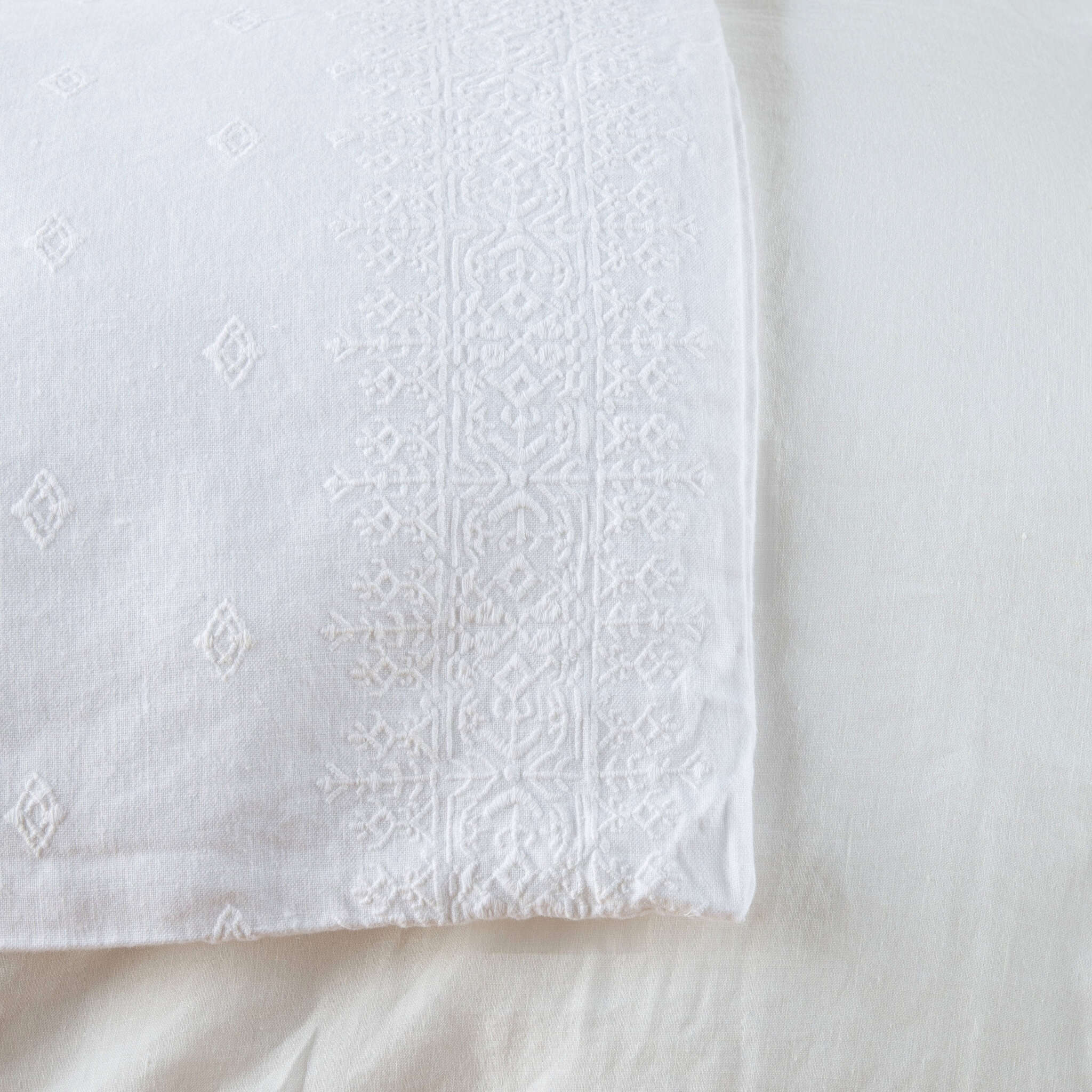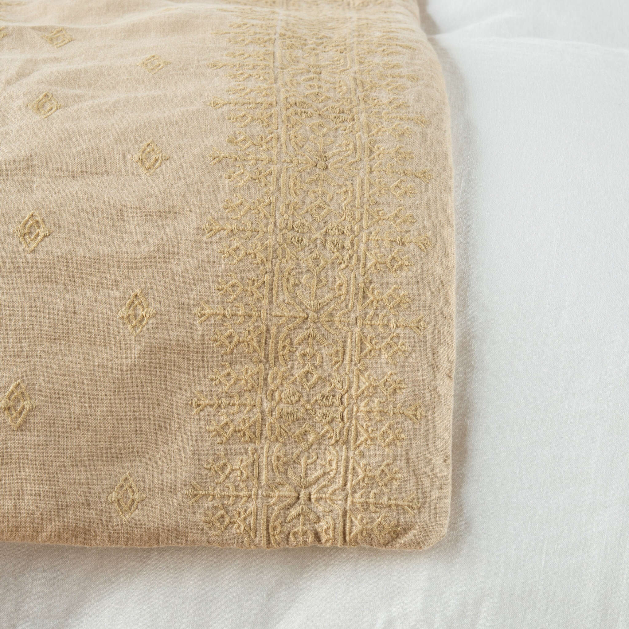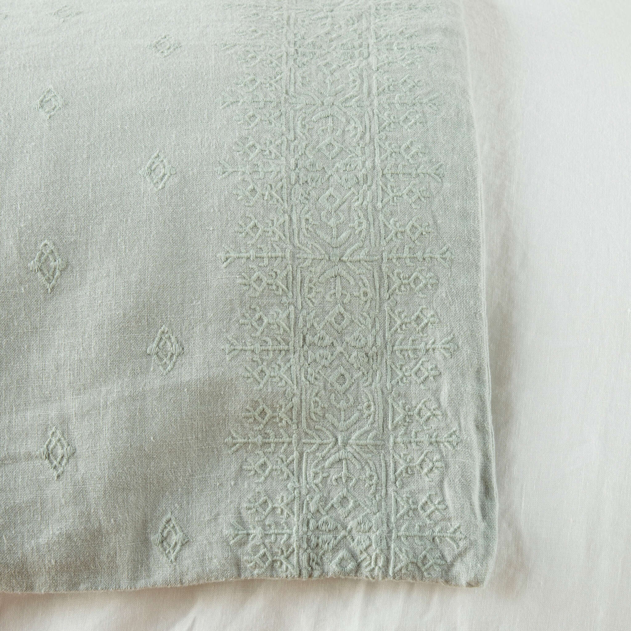 The Ines Blanket features an all-over cotton embroidery on our rich midweight linen. With intricate embroidery bands framing each long edge, the pattern shows subtly in our lighter hues and as a brilliant two-tone in our deeper colors. Lightly padded and backed in our signature linen, this blanket is true easy elegance.