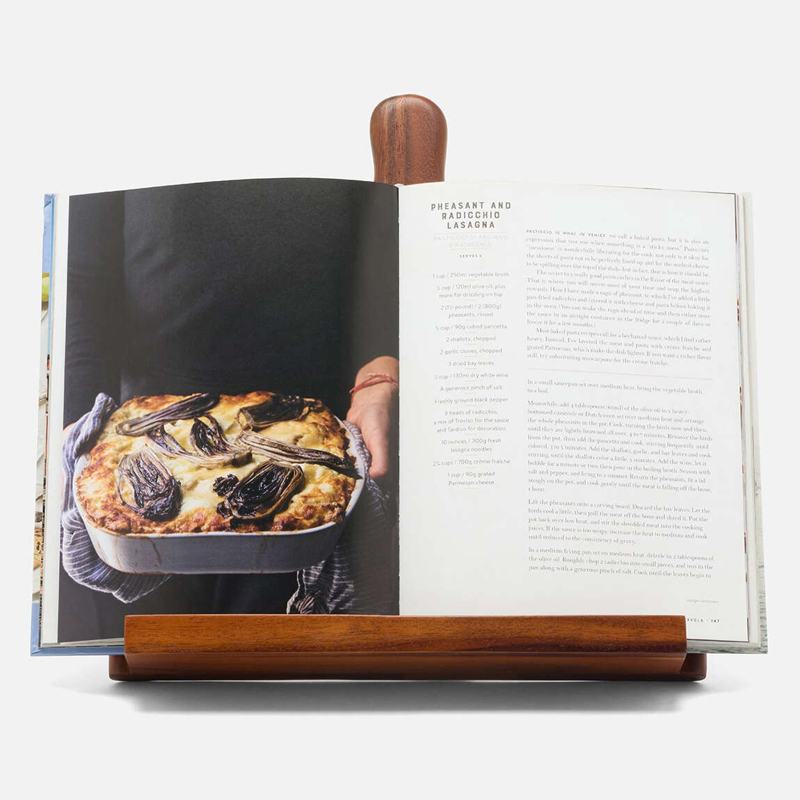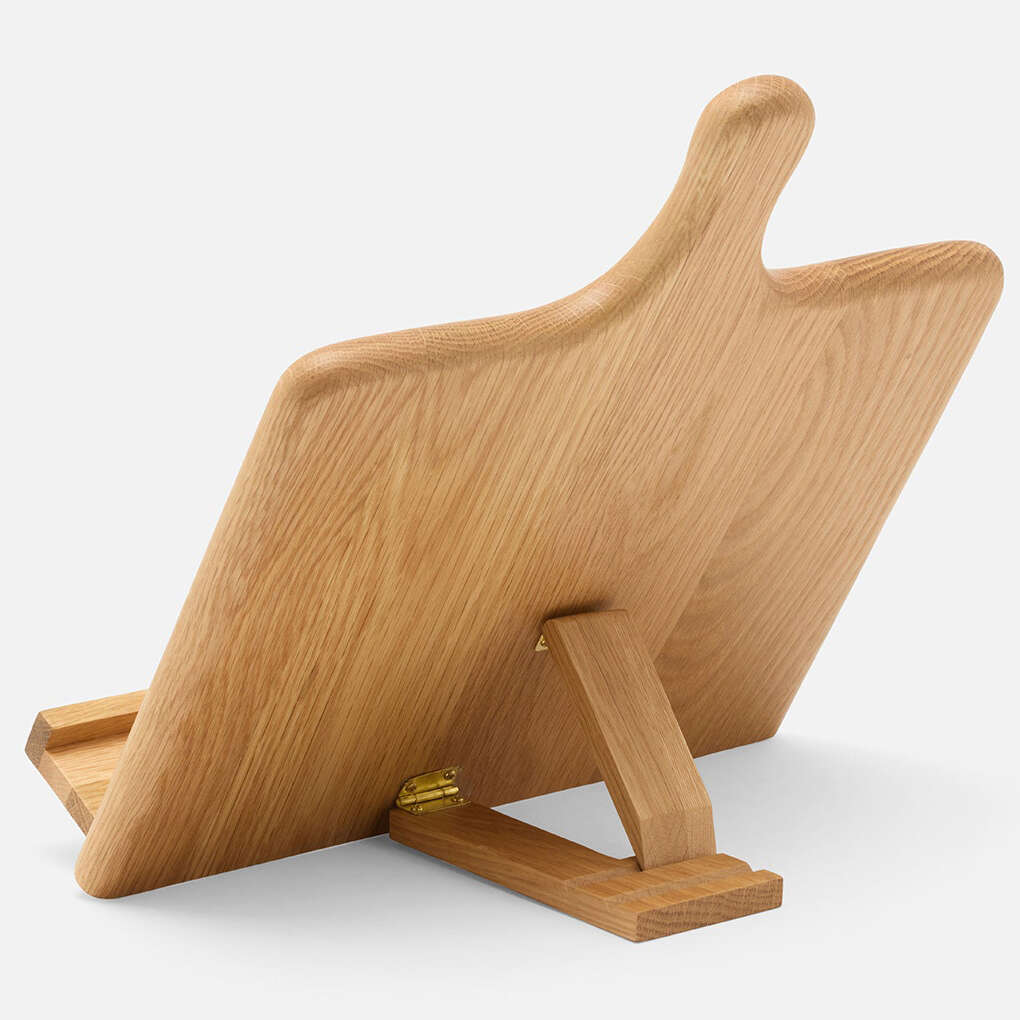 Crafted from wood, the Bronwyn recipe stand adds warmth and depth to a space.