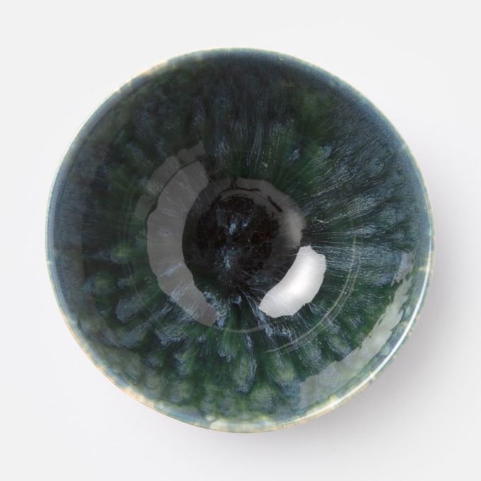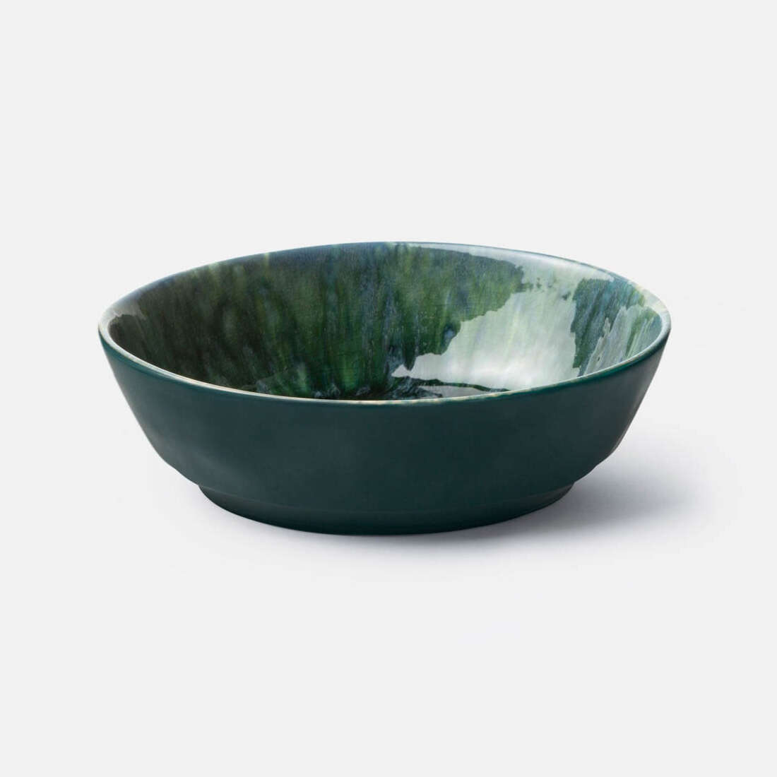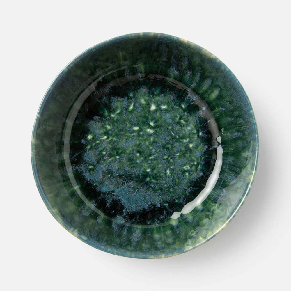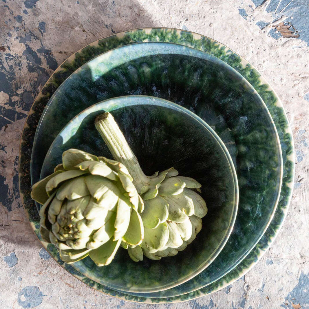 Bria's multi-layered effect isn't simply painted on by hand; take a closer look to see that this vibrant design of blues and greens is created by Teal Reactive glaze in a hot kiln. The process lets a kaleidoscope of shades pour over each plate and bowl while the natural off-white stoneware peeks out around the edges.