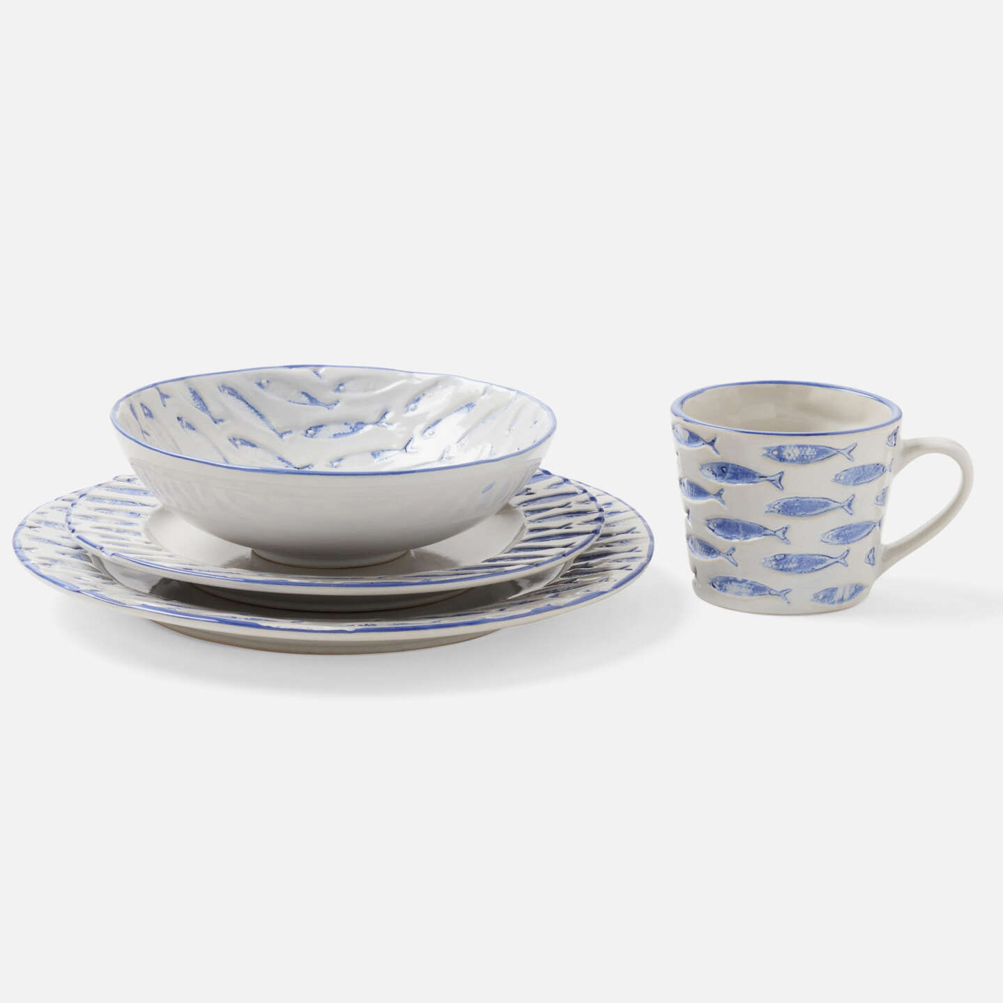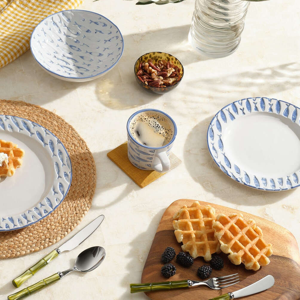 Submerge into aquatic elegance with our Gideon. Made from stoneware with hand-painted blue fish, this collection exudes nautical sophistication.